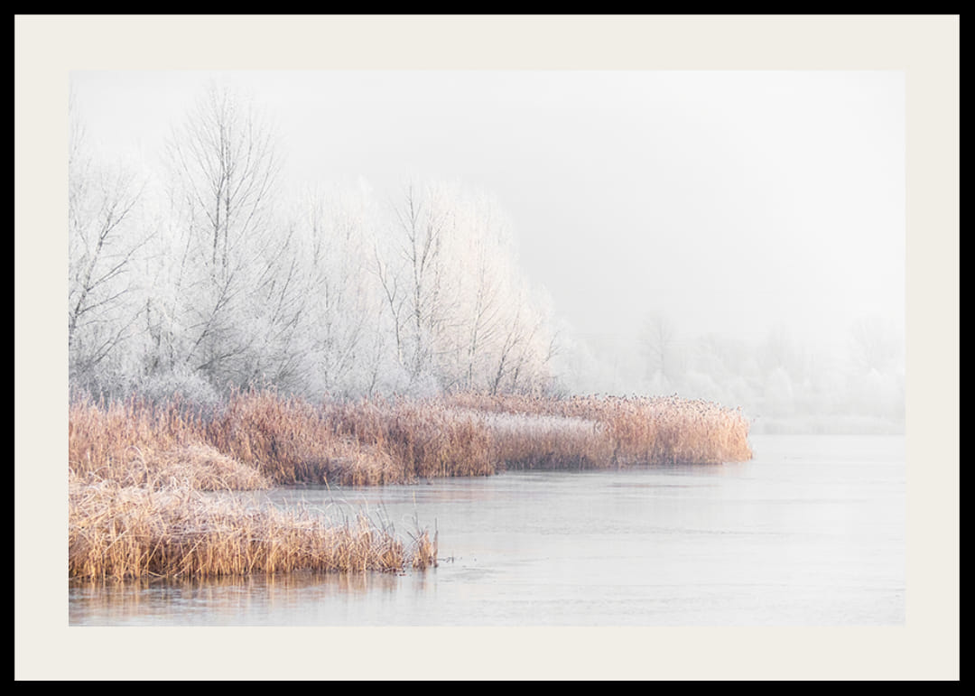 Siv i myke gulbrune toner strekker seg langs innsjøbredder der frostbitte trær reiser seg mot en disig himmel. Landskapet er omgitt av mykt vinterlys som myker opp fargene og skaper en fredelig atmosfære. Denne plakaten fanger naturens skarphet om vinteren og passer fint inn i rom inspirert av nordisk natur.
