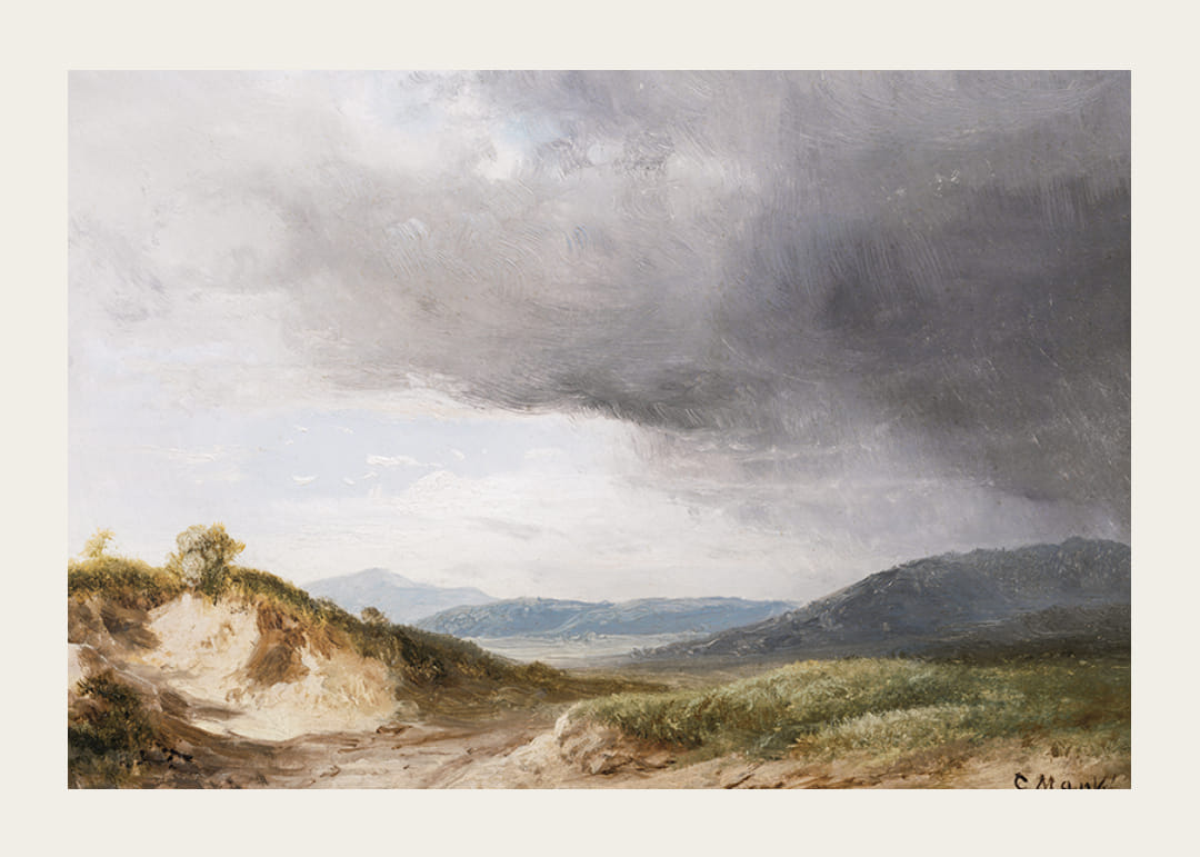 Plakat med maleriet "Hilly Landscape With Cloudy Skies" av den slovakiske kunstneren Károly Markó fra år 1835.