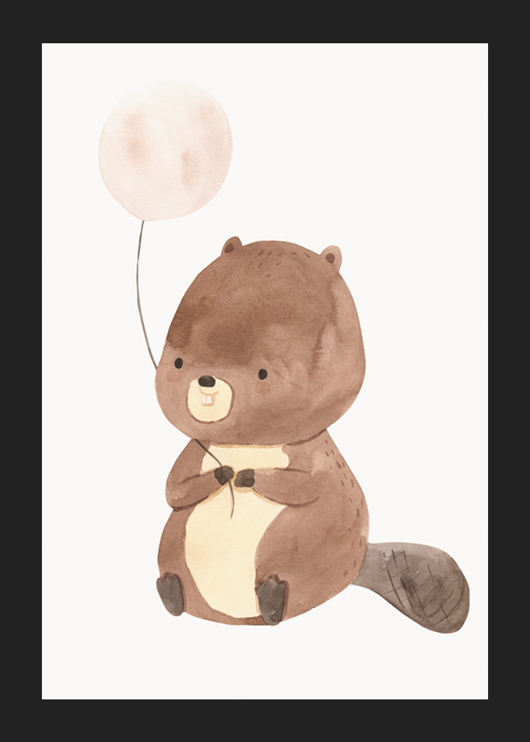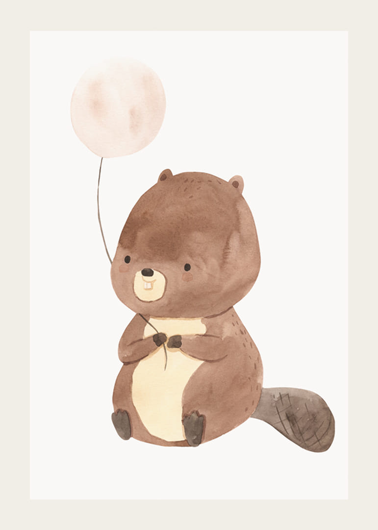Motivet består av en tegneseriebever i myke brune og beige nyanser, som sitter med en lys ballong i potene. Den enkle hvite bakgrunnen får figuren til å skille seg ut og skaper et rolig inntrykk. En dekorativ plakat som gir barnerommet en leken og varm atmosfære uten å ta over helheten.