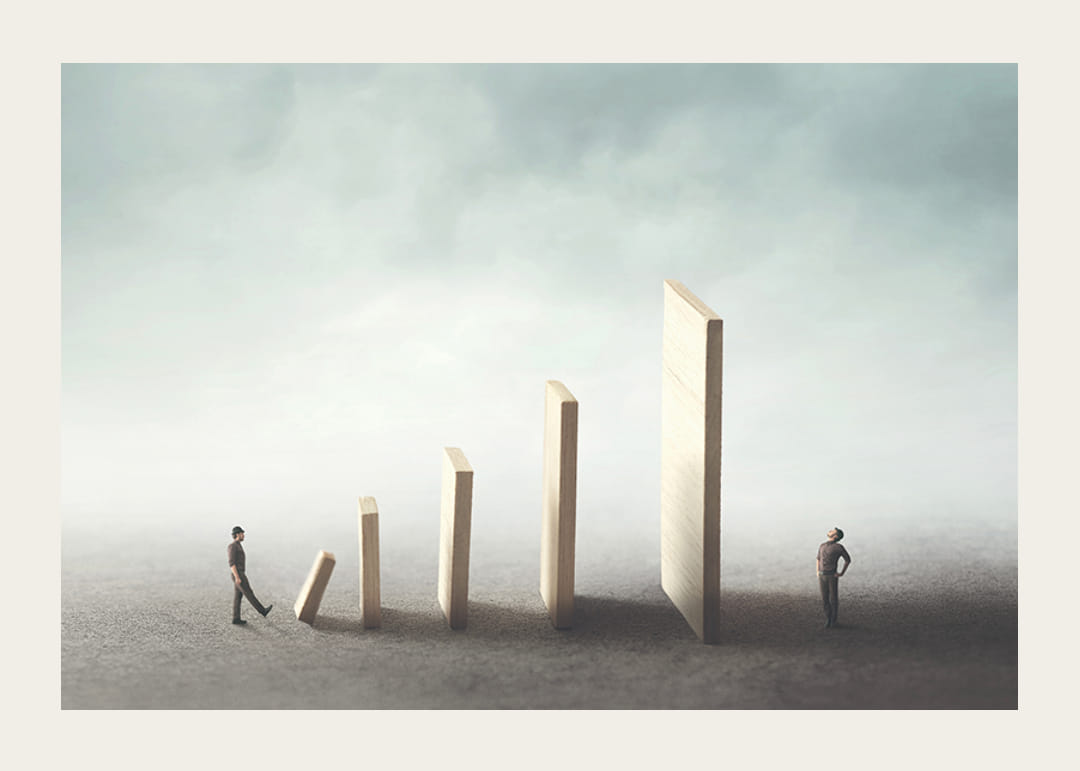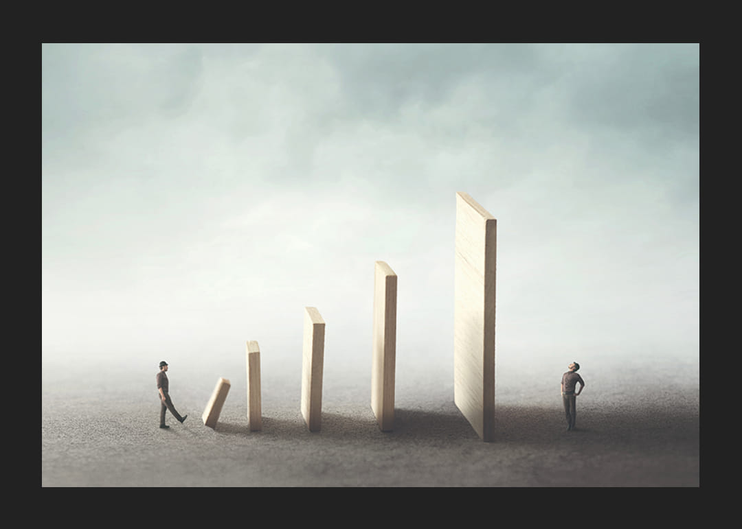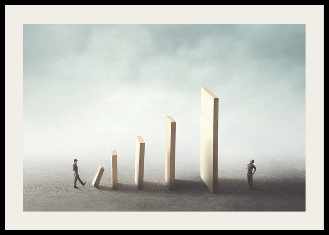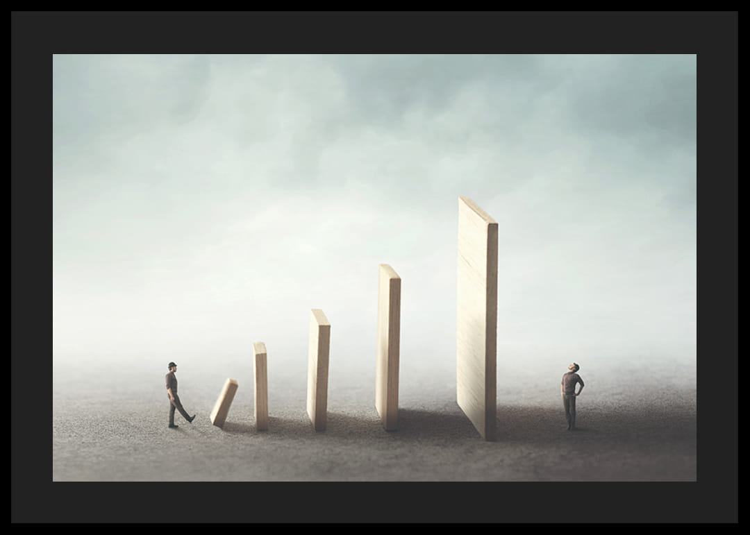 To små figurer står på hver side av en rad med dominobrikker som øker i størrelse. Den ene personen sparker den første dominoen over ende, noe som utløser en kjedereaksjon mot den andre, som ser på situasjonen med armene i kors. Den konseptuelle plakaten er egnet for kreative miljøer.