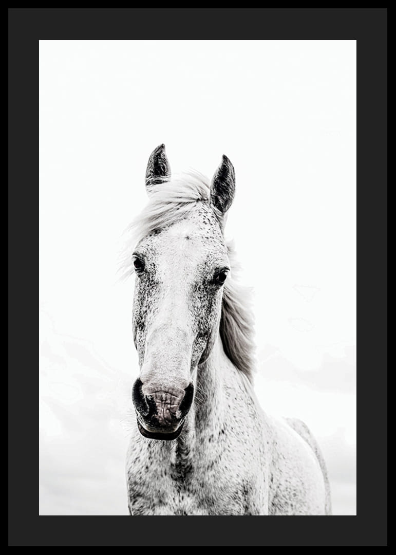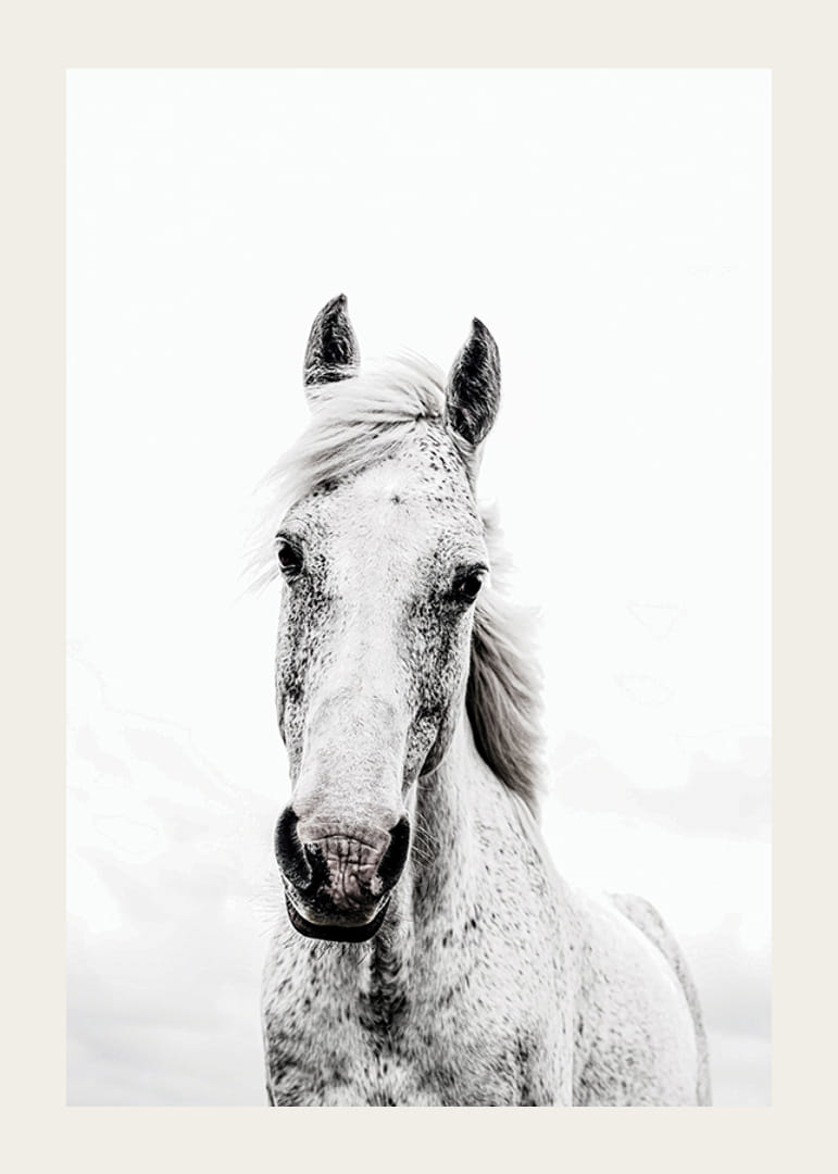 Nærbilde av en hvit hest med tydelige gråtoner og subtile prikker i pelsen. Hestens uttrykksfulle øyne og forsiktig svaiende man er fanget mot en helt lys, nesten hvit bakgrunn. Det minimalistiske og stilige preget gjør denne plakaten enkel å kombinere med forskjellige interiørstiler, spesielt i stuen eller på soverommet.