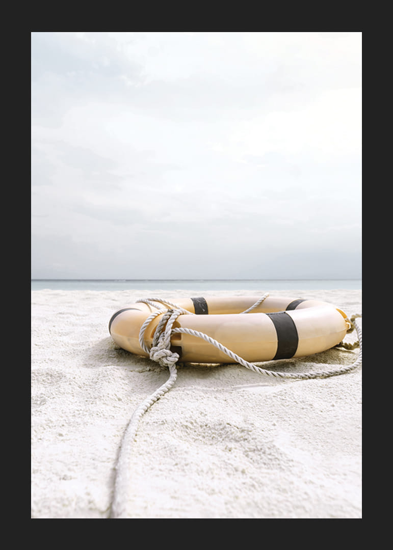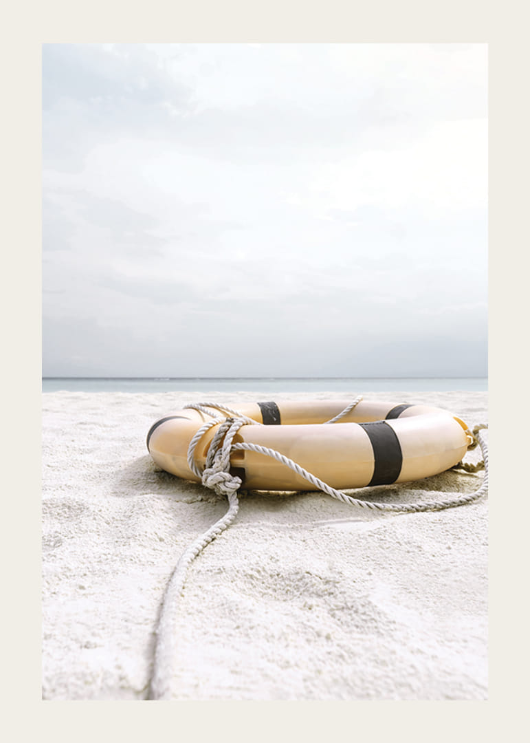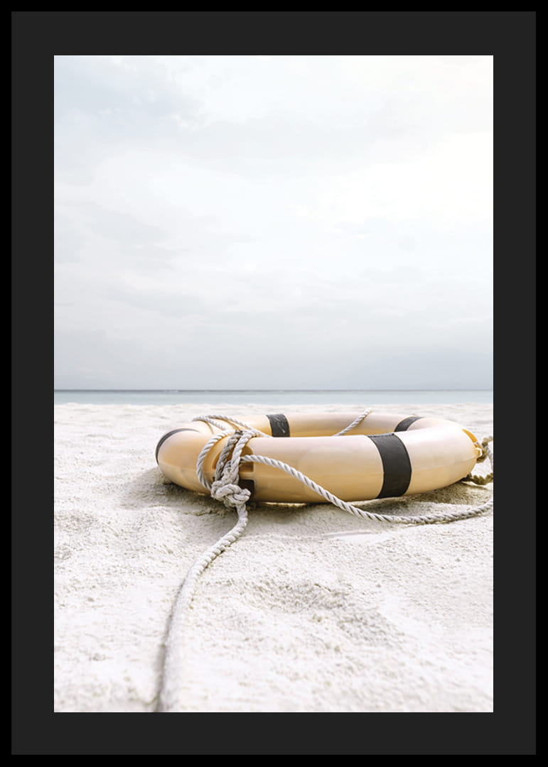 En livbøye med tau ligger på en lys sandstrand med utsikt over et rolig, disig hav. Myke beige og hvite toner dominerer motivet, som har et luftig og diskret uttrykk. Plakaten gir en sommerlig følelse og fungerer flott i en stue eller gang for en lys og avslappet atmosfære.