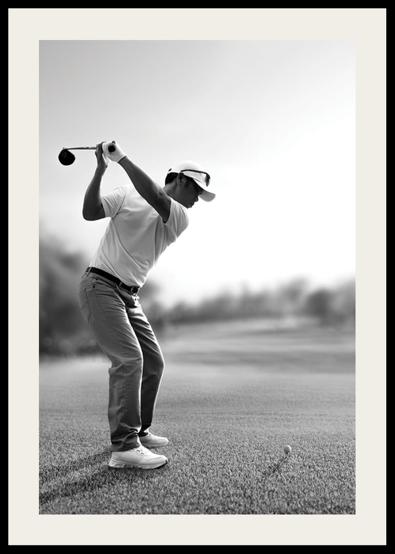 En golfspiller i klassisk stilling før en drive står mot en uskarp bakgrunn av en åpen golfbane. Klare kontraster og monokrome toner fremhever kroppens bevegelse og konsentrasjon. Denne plakaten gir et sporty preg og passer for kontorer, fritidsrom eller moderne stuer.