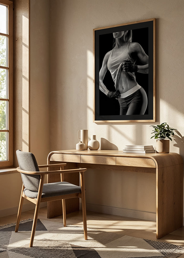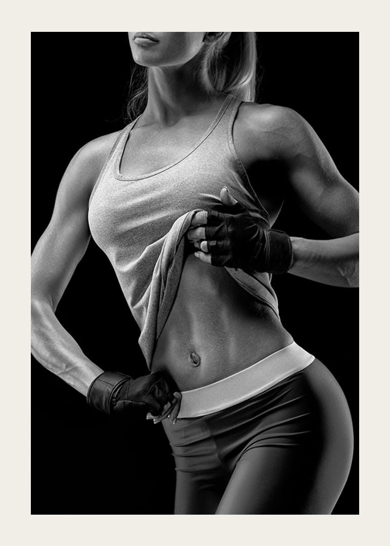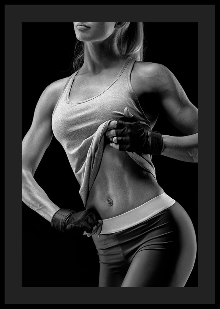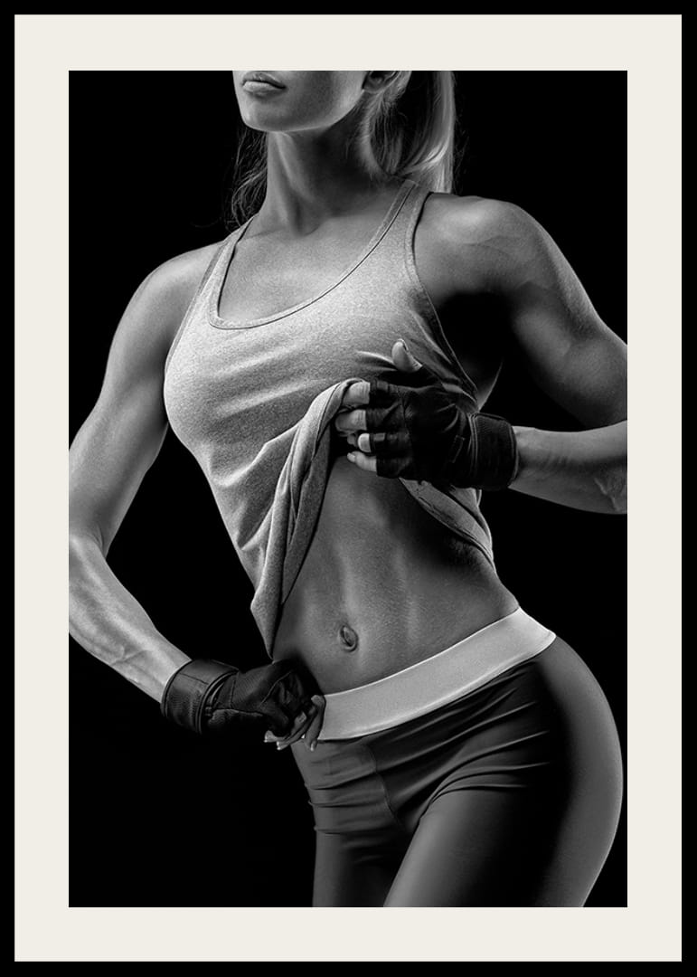 En atletisk kvinne fremhever magemusklene og armene sine ved å løfte tanktoppen sin i dette svart-hvite motivet. Kontrasten mellom hud og treningsklær som er fremtredende mot en mørk bakgrunn gir plakaten et tydelig sporty preg. Passer for hjemmegym eller treningsrom der energi og styrke verdsettes.