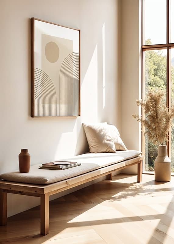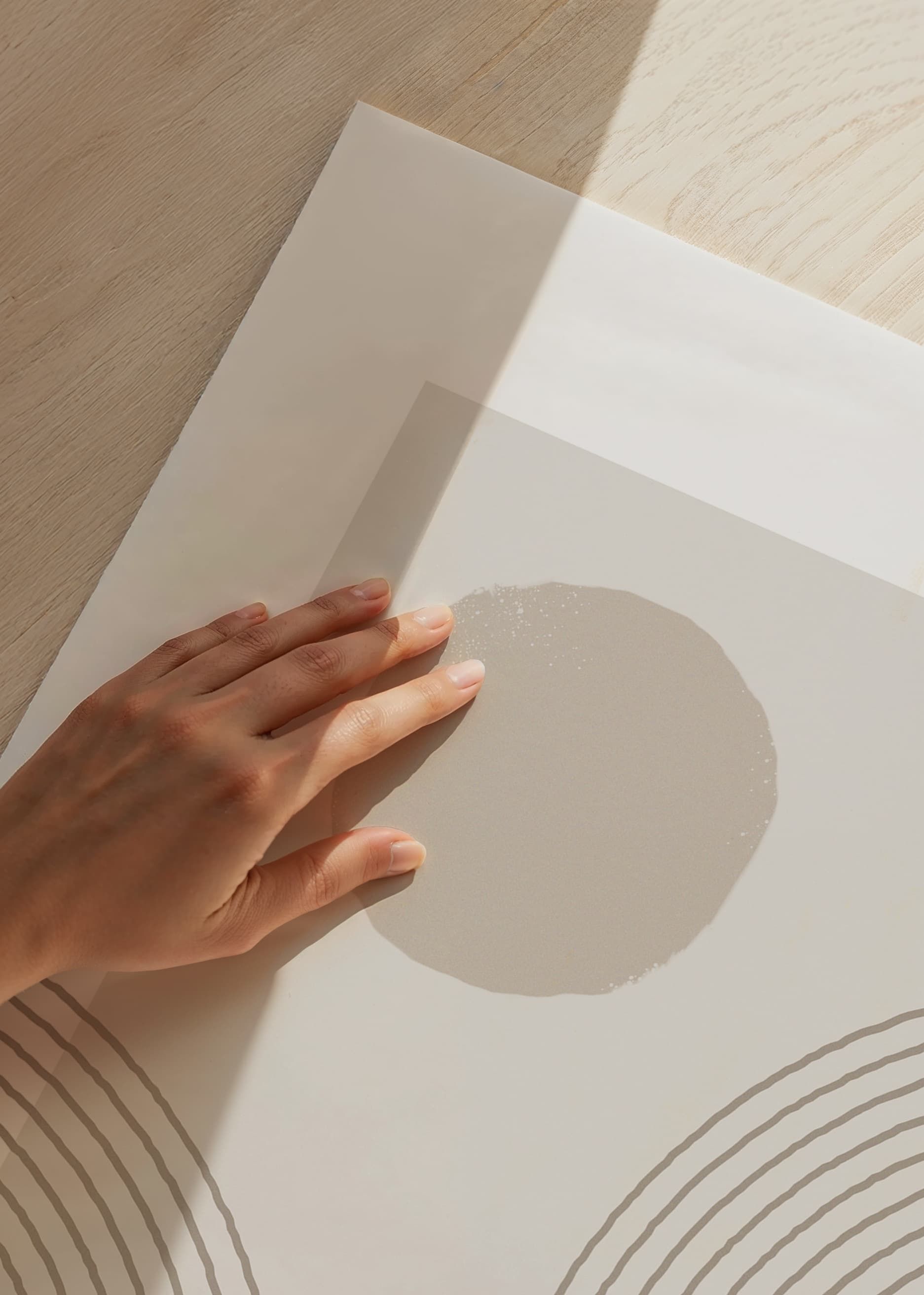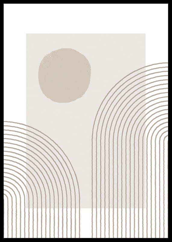 Motivet består av tynne, bueformede linjer i myke beige nyanser som møtes i plakatens nederste kant. En enkel sirkel og et rektangel i en lignende tone skaper et harmonisk geometrisk uttrykk. Denne plakaten gir et moderne og diskret inntrykk som passer godt i både stuer og kontorer.