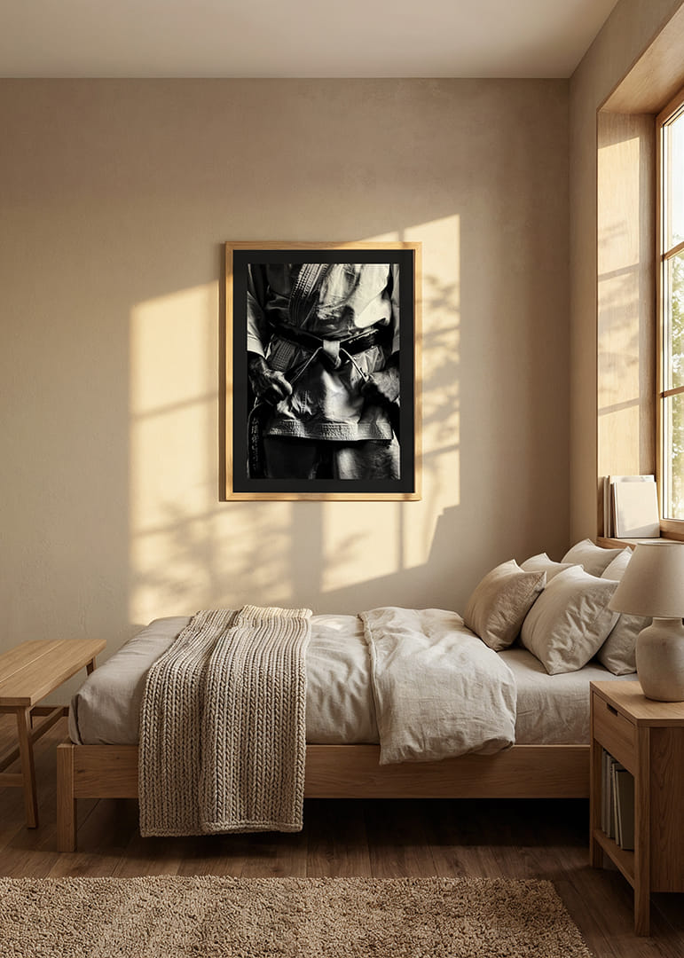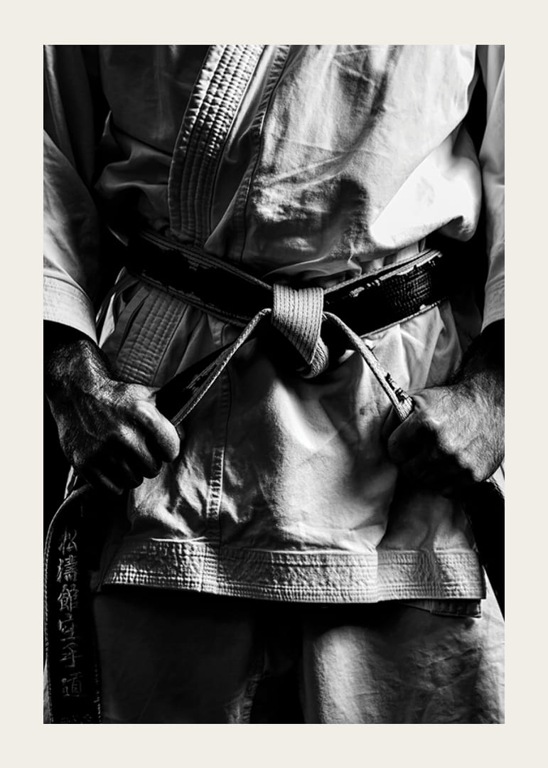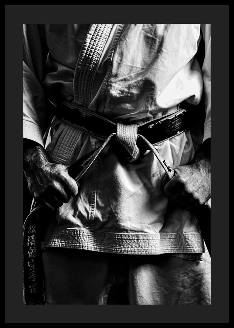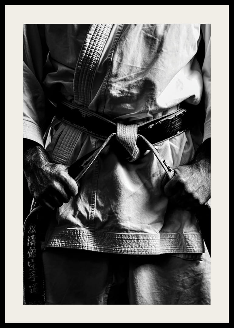 Et detaljert nærbilde av et svart belte knyttet rundt livet til en person kledd i tradisjonell kampsportantrekk. De fremhevede hendene og de tydelige stofflagene gir plakaten et grafisk og fokusert uttrykk. Perfekt for hjemmegym, treningsrom eller andre miljøer der energi og disiplin verdsettes.