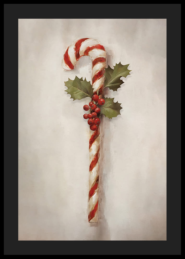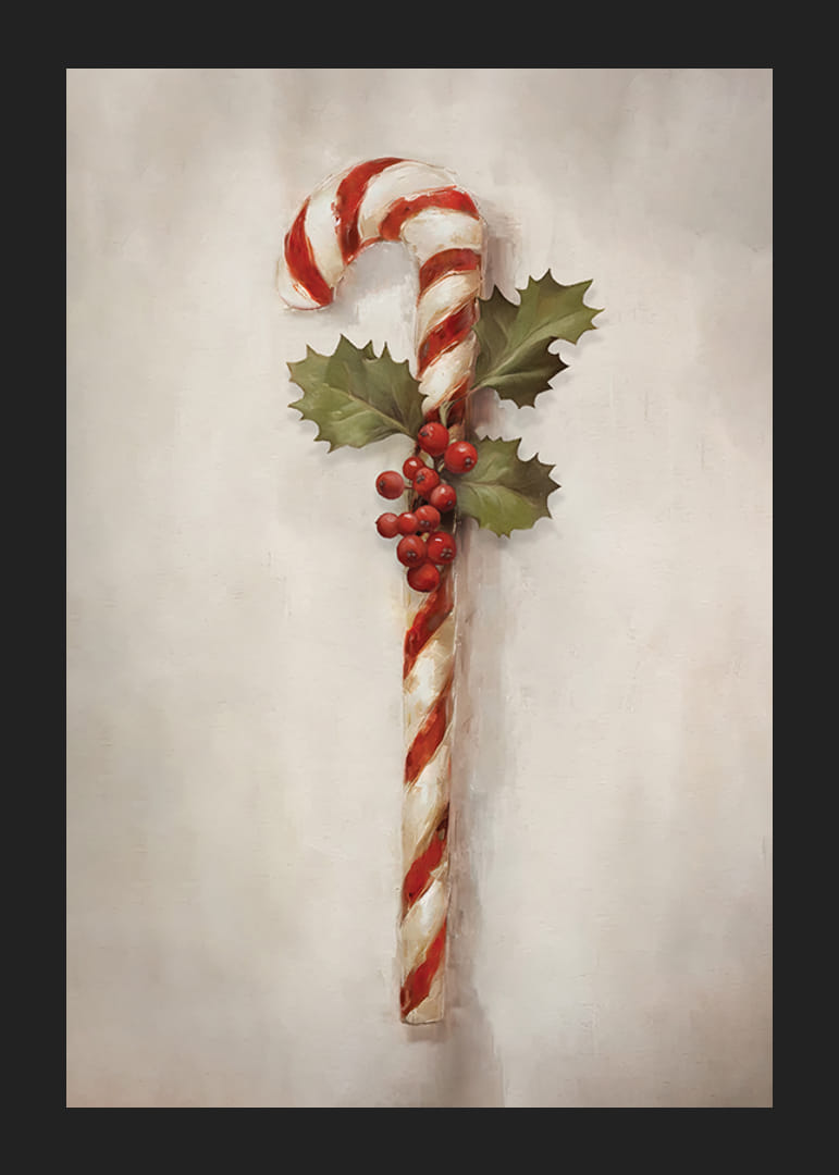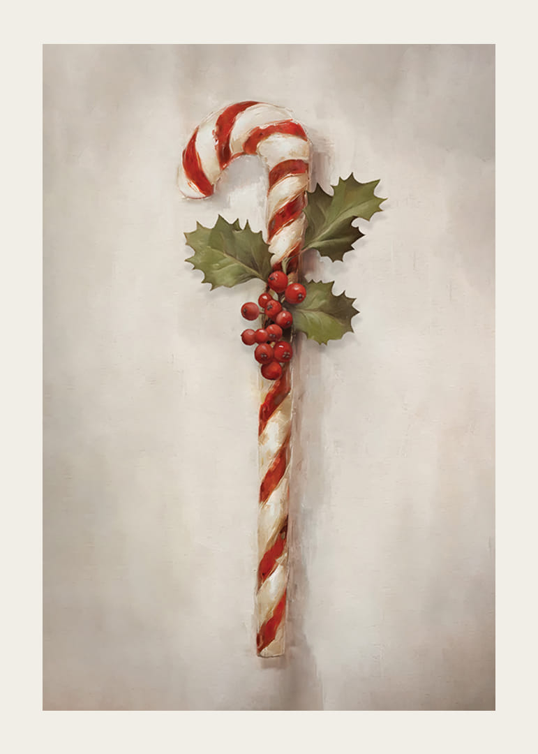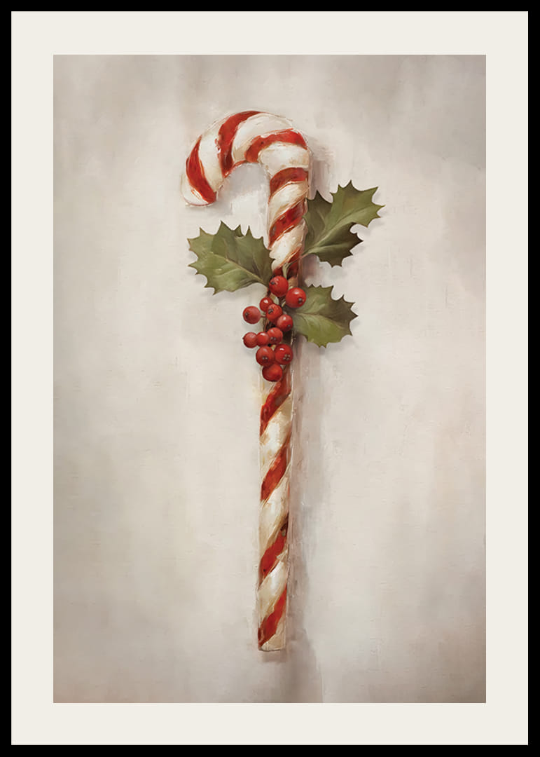 Rød- og hvitstripete sukkerstang er utsmykket med kristtornblader og klaser av røde bær mot en mykt teksturert lys bakgrunn. Den håndmalte følelsen skaper en tidløs julestemning. Denne plakaten er perfekt som en sesongdetalj på kjøkkenet, i gangen eller på barnerommet, og gir et subtilt, festlig preg.