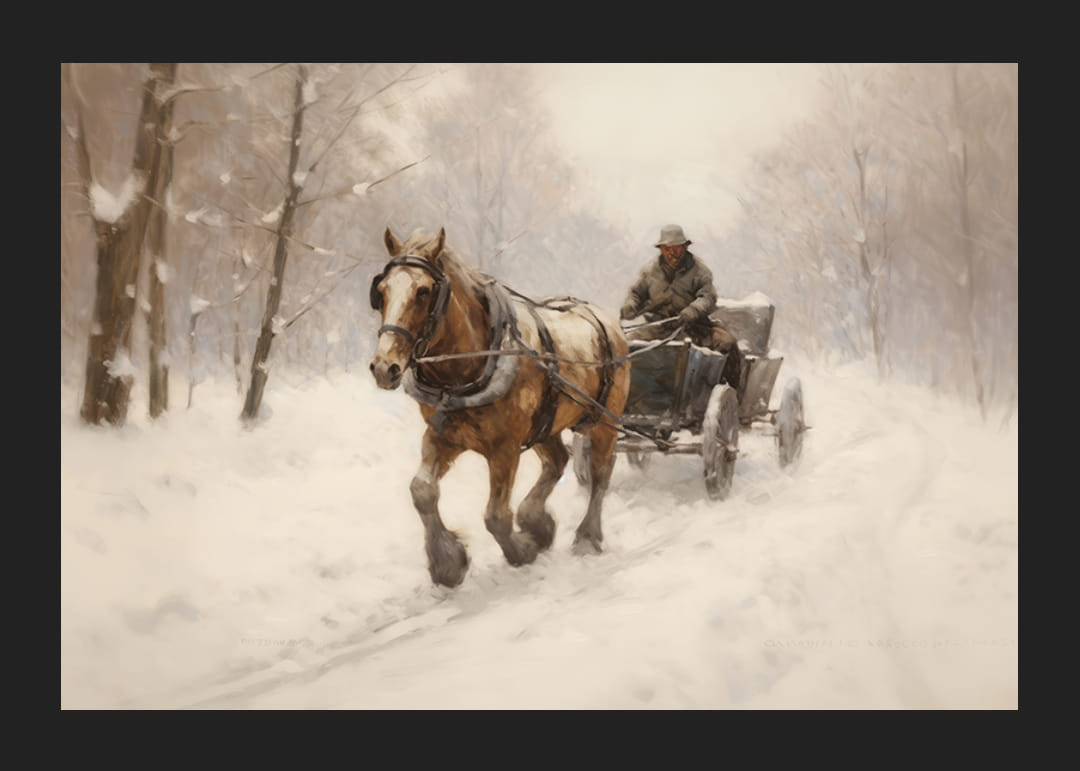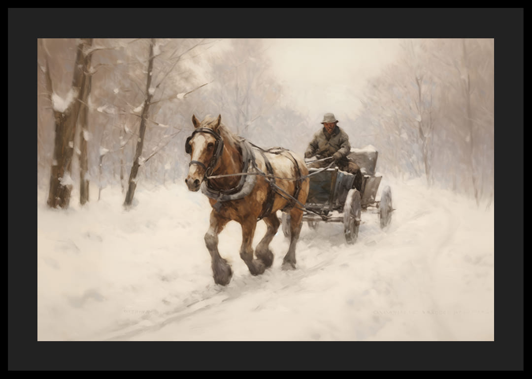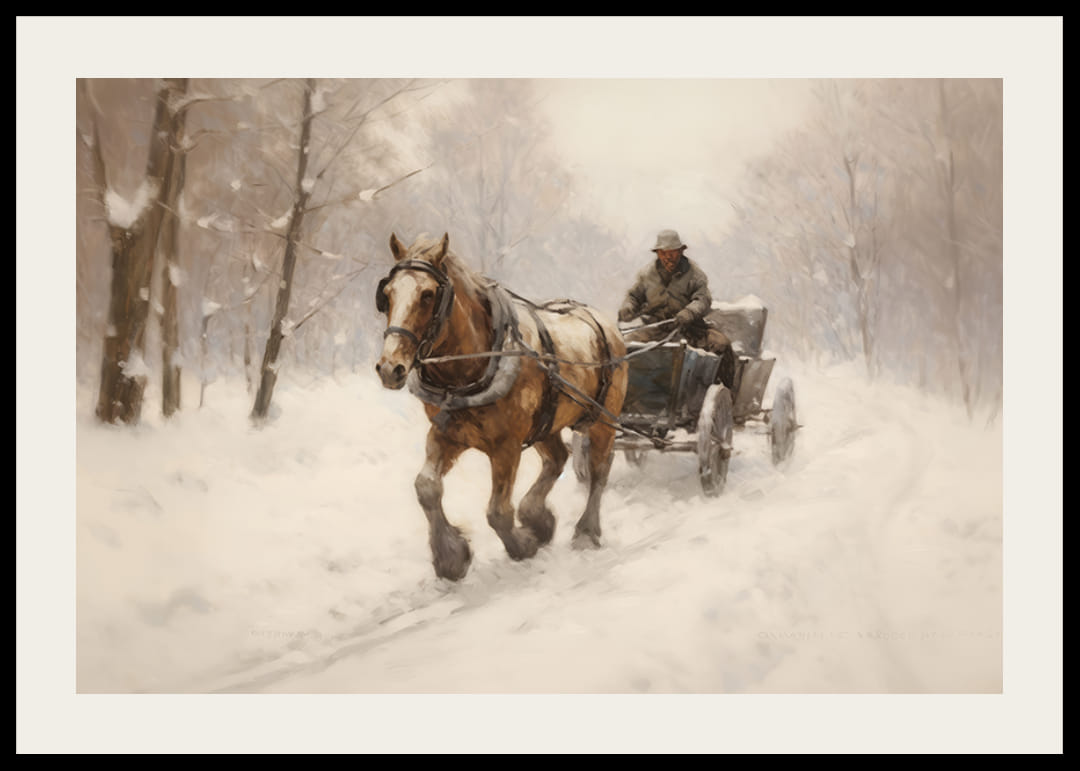 En hest og slede kjøres av en mann gjennom et stille snødekt landskap med vinterkledde trær langs veien. Myke og nøytrale farger dominerer, med hvitt, brunt og grått som skaper et rolig og sesongbasert motiv. Denne plakaten gir en følelse av vinter og tradisjon, og passer godt i en stue eller gang.