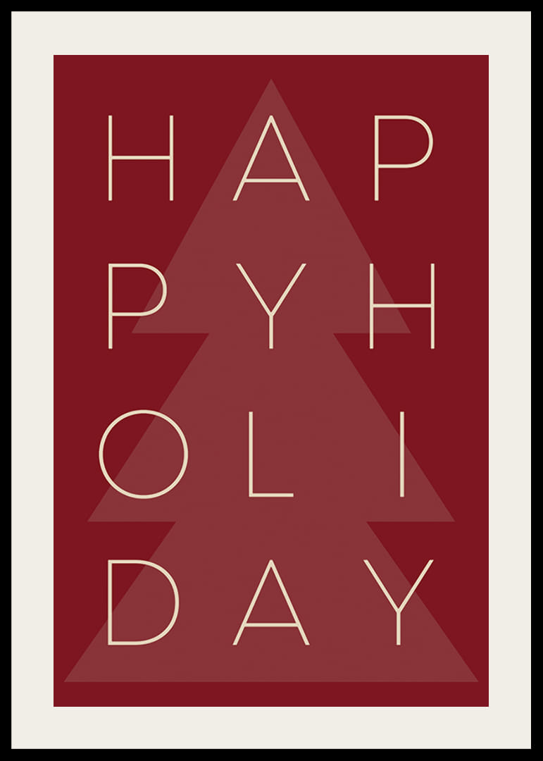 Beige bokstaver danner ordene «Happy Holiday» over et stilisert mørkerødt juletre, sentrert på en rød bakgrunn. Det grafiske og minimalistiske designet gir plakaten et moderne og sesongbasert uttrykk. Passer fint som en del av en vinter- eller juleinspirert bildevegg i en stue eller gang.