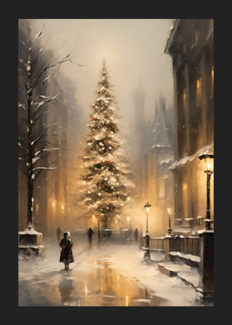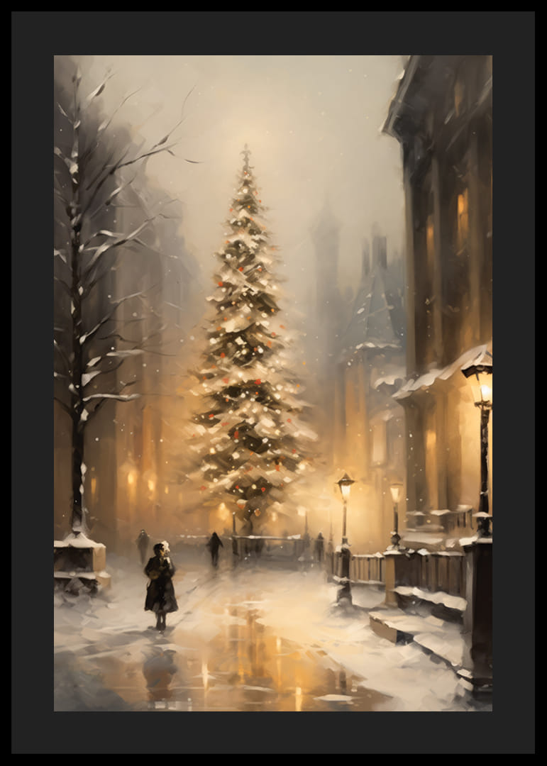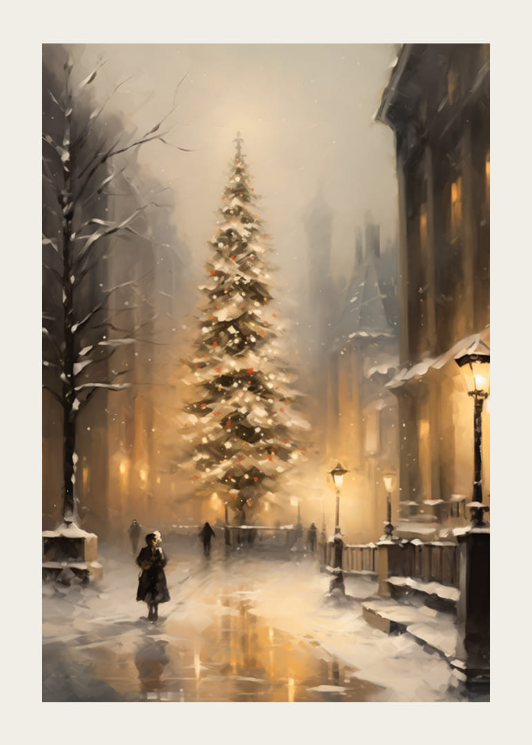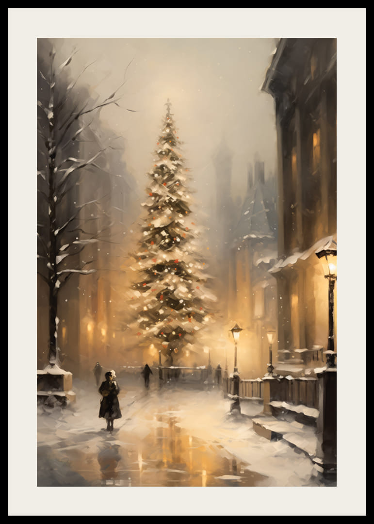 Høye bygninger og snødekte trær rammer inn et opplyst juletre midt i en vinterlig gate, hvor gatelys og snøfall myker opp bybildet. Myke gule og grå toner gir motivet et tidløst preg. Denne plakaten skaper en varm vinterstemning og passer til både stuer og ganger i juletiden.