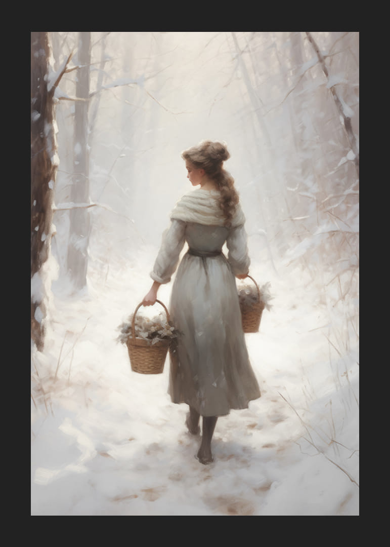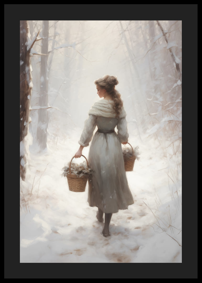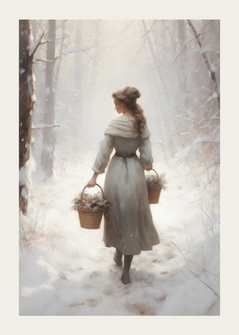 En kvinne i lang kjole sees gå langs en snødekt sti med to kurver fylt med vintergrønt i hendene. Slanke trær er innrammet i milde toner, og et mykt vinterlys filtrerer inn mellom grenene. Med sine dempede farger er denne plakaten perfekt for å skape en rolig og tradisjonell vinterfølelse i hjemmet.