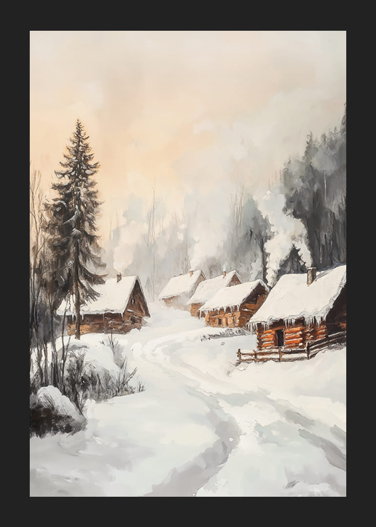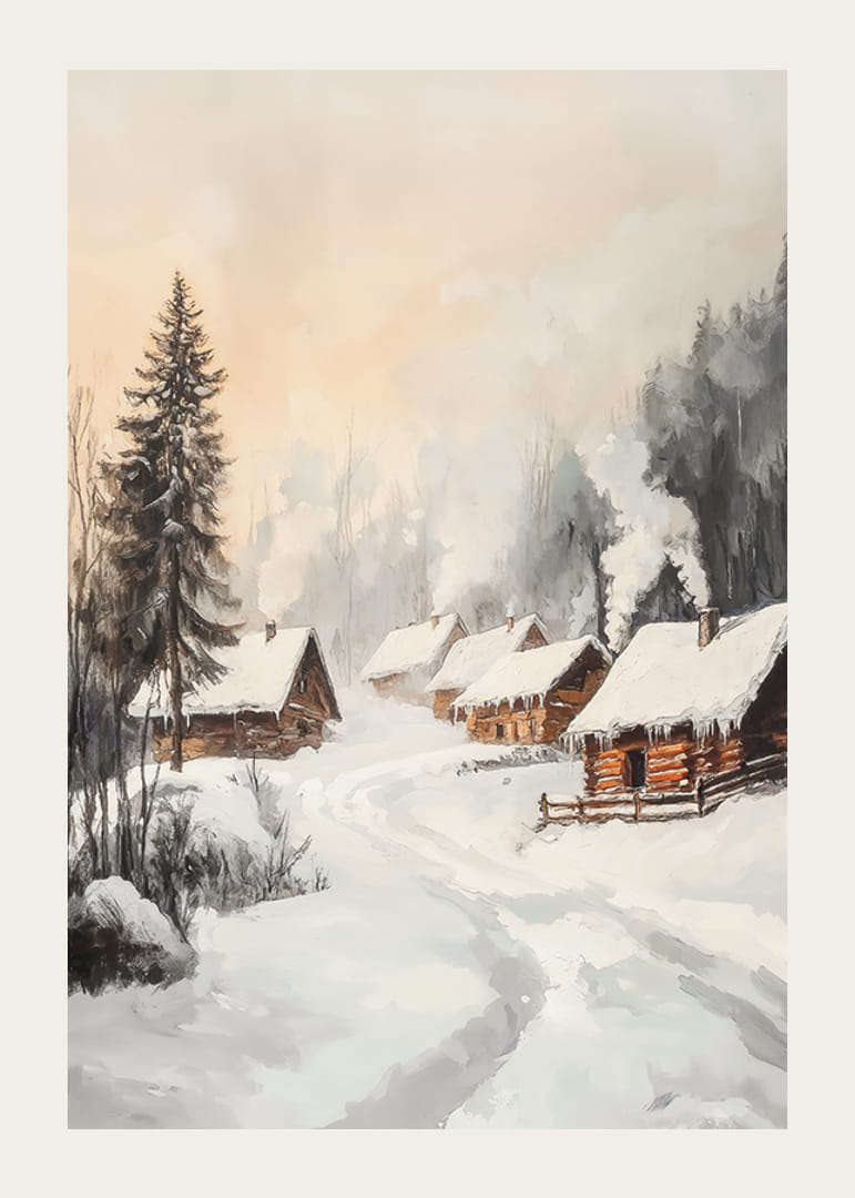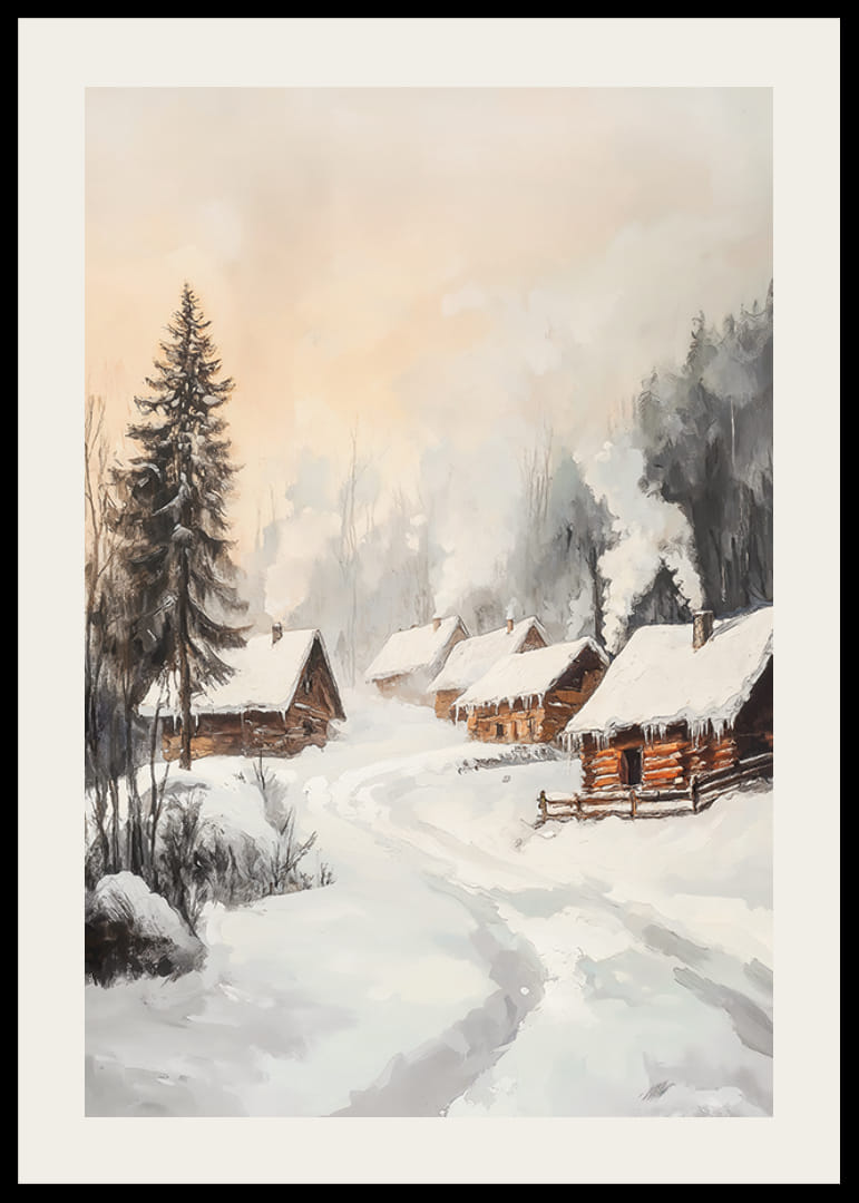 En svingete vei fører gjennom et vinterlandskap med flere tømmerhytter omgitt av snødekte grantrær og trær. Tak og bakke er dekket av hvit snø mens røyk stiger rolig opp fra skorsteinene. Dempede beige og grå toner møter varme brune elementer og gir plakaten et mykt uttrykk som passer til hjem med plass til sesongmessig ro.