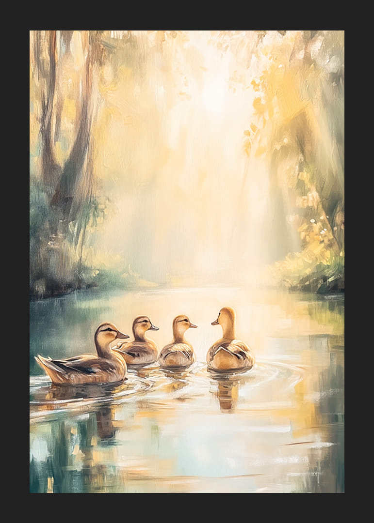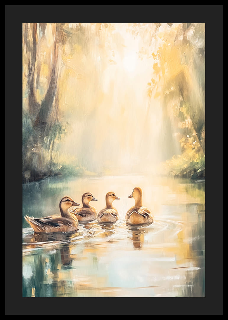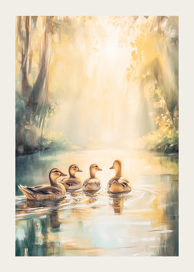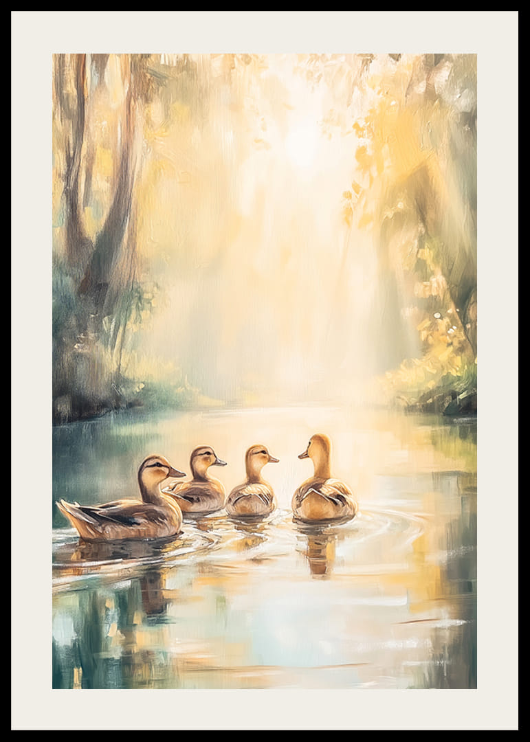Fire ender svømmer sammen i en rolig bekk omgitt av høye trær og mykt morgenlys. Gylne og grønne toner dominerer motivet, som bringer tankene frem tidlig vår eller sensommer. Denne plakaten gir en fredelig, naturlig følelse og passer for rom der man ønsker en avslappende atmosfære.