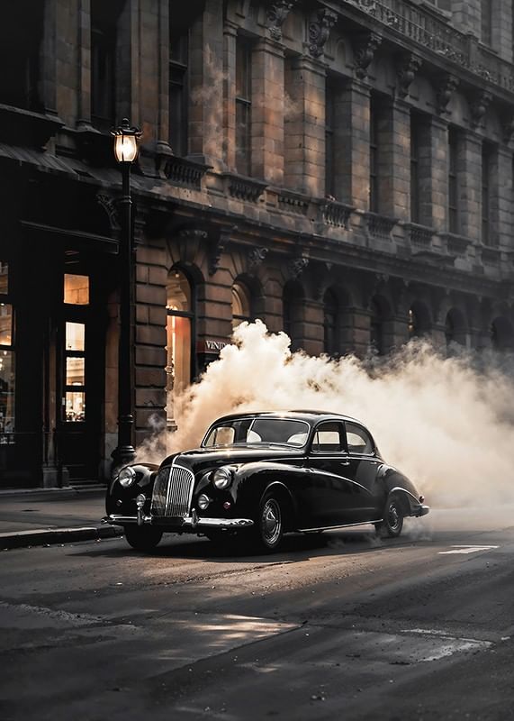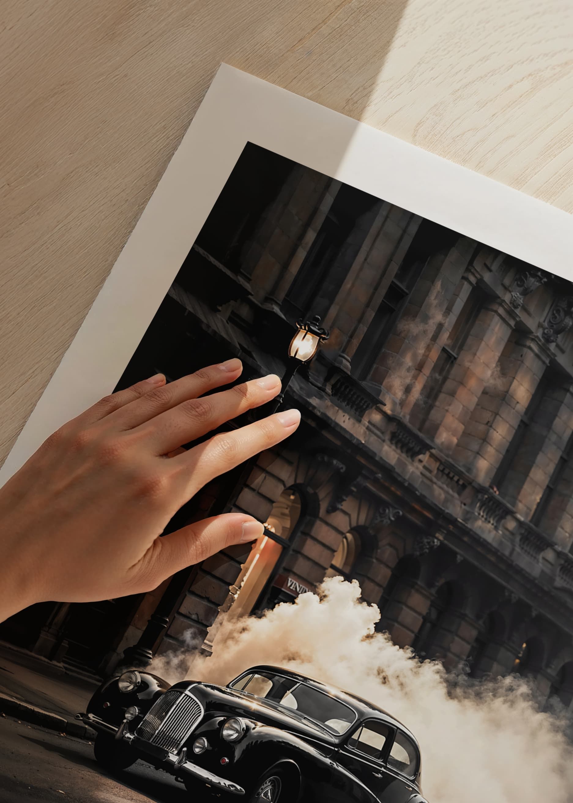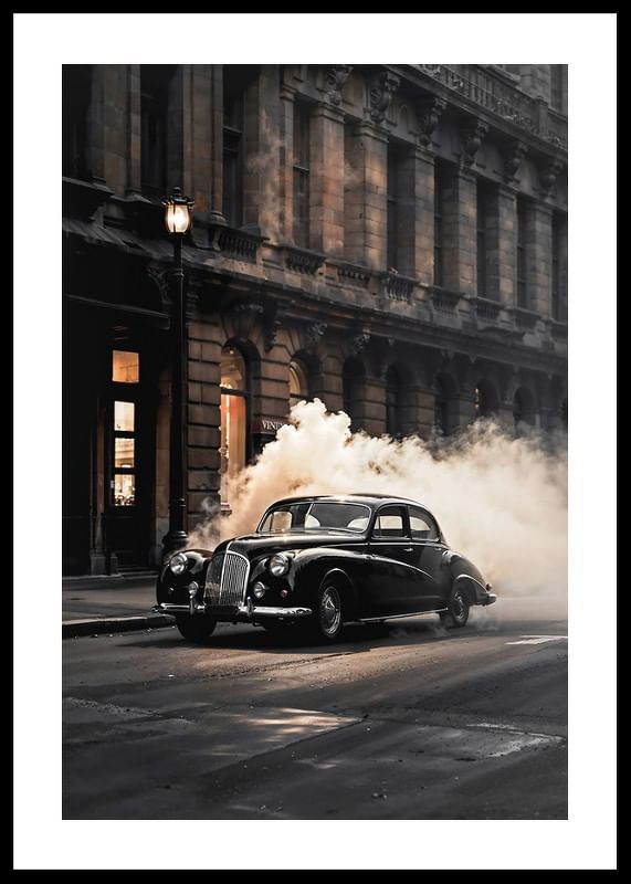 En klassisk svart veteranbil kjører langs en bygate med røyk som stiger opp mot fasaden til en gammel steinbygning. Detaljerte skygger og varmt lys fra gatelykten skaper en tidløs følelse. Denne plakaten tilfører urban dybde og en nostalgisk tone til en stue, gang eller kontor.