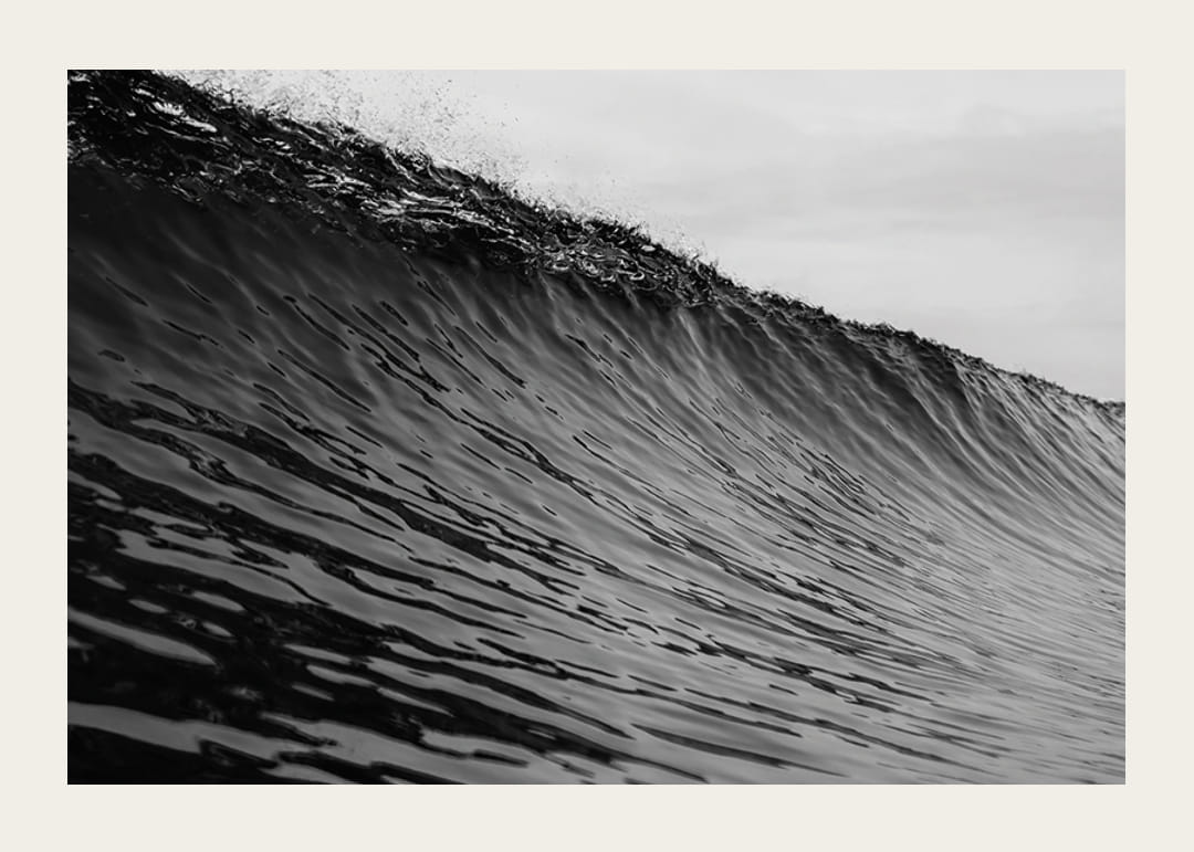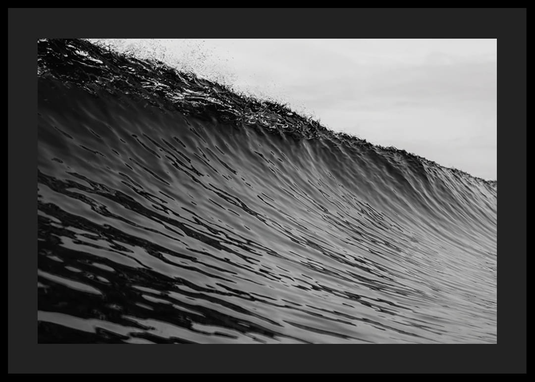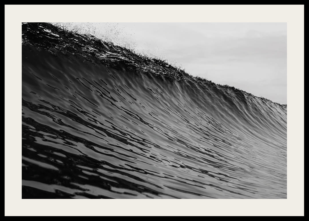 Plakat med et fotografi som fanger et øyeblikksbilde av en mektig bølge rett før den bryter. Bølgens kraft og bevegelse vises i svart-hvitt, noe som gir en dramatisk og nærmest hypnotisk effekt.