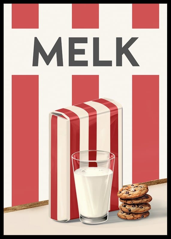 Opplev skandinavisk enkelhet og retrosjarm med denne stilige plakaten med et akvarellmaleri av melk. Denne illustrasjonen fanger tidløsheten til et glass kald melk, servert med sjokoladekjeks, ved siden av en melkekartong dekorert med klassiske røde og hvite striper. Det minimalistiske designet og den harmoniske fargepaletten gjør denne plakaten til en perfekt detalj på kjøkkenet eller spisestuen. En hyllest til hverdagens gleder, som formidler følelsen av hjemlighet og gode stunder.