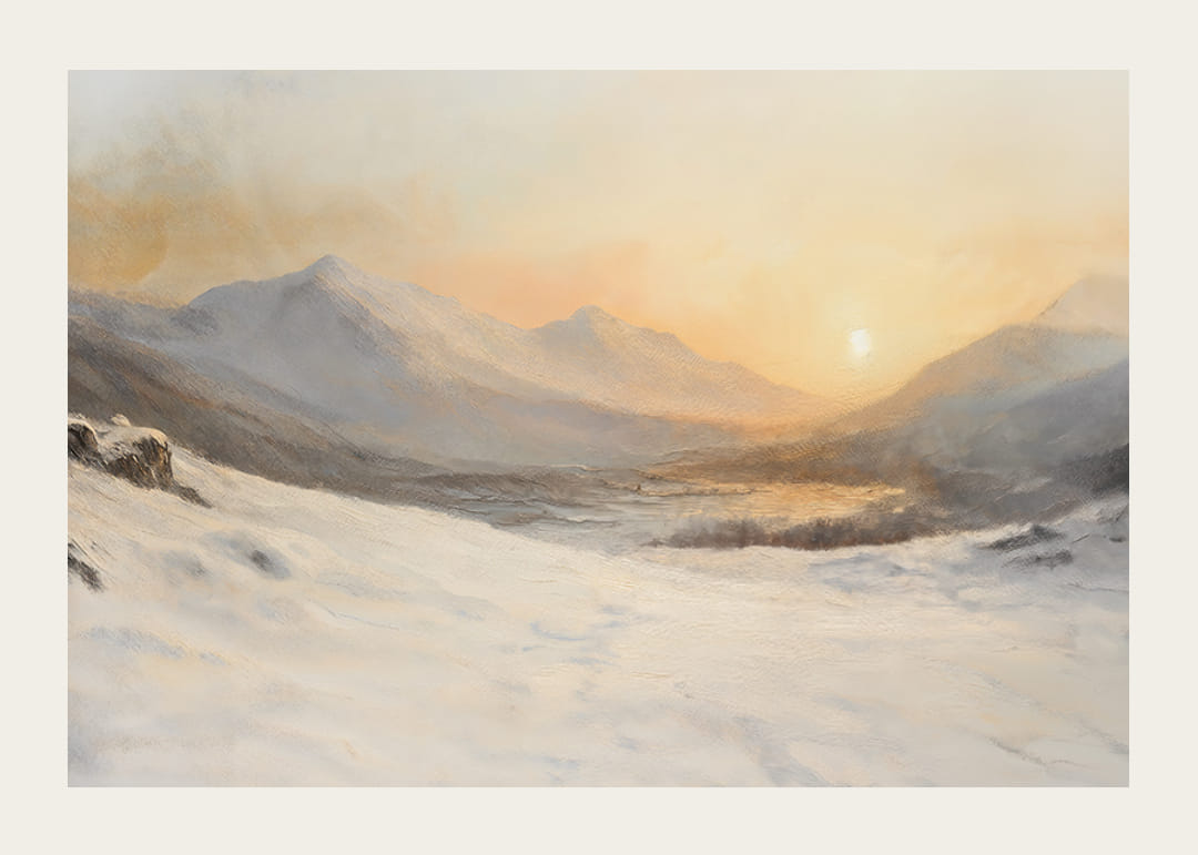 Fang stillheten i naturen med denne plakaten som viser et snødekt fjellandskap badet i solnedgangens gylne lys. De myke tonene og majestetiske fjellene skaper en følelse av ro og tidløshet. Perfekt for å bringe harmoni og naturlig skjønnhet til hjemmet ditt, denne plakaten feirer vinterens fredelige sjarm og storheten i landskapet