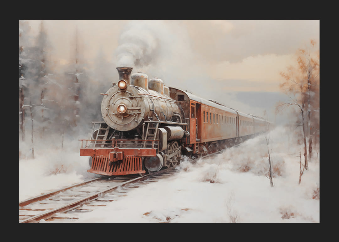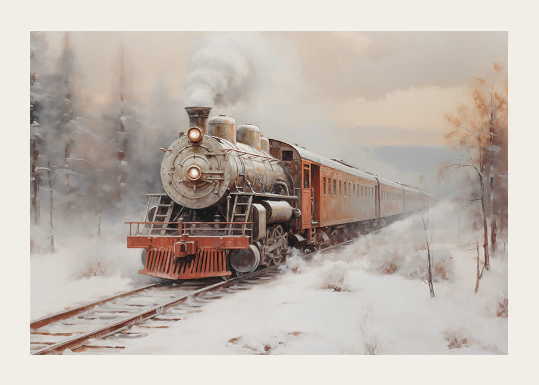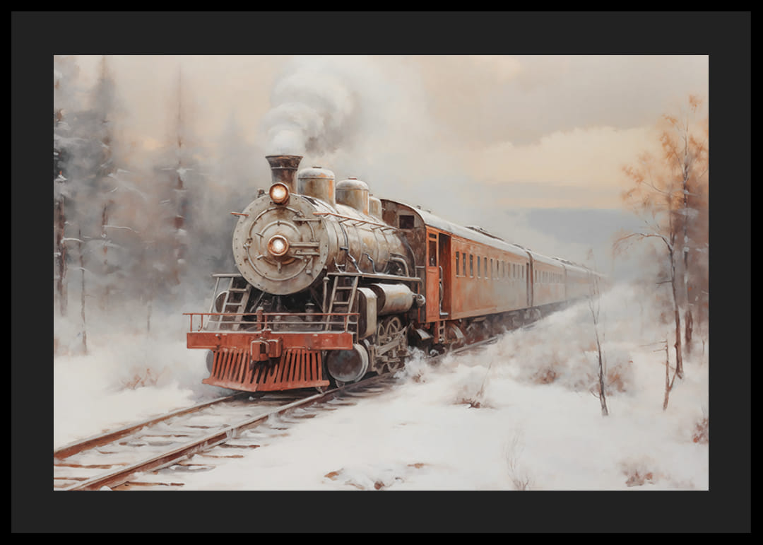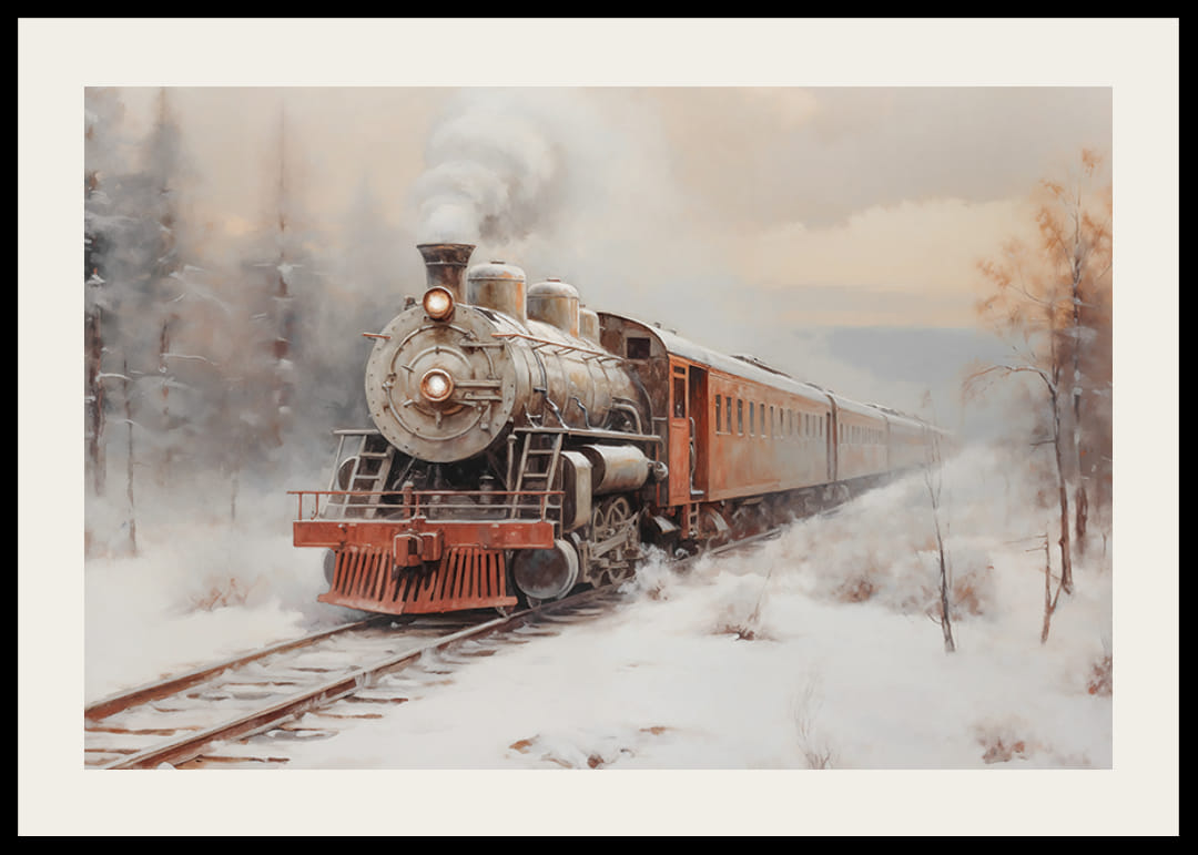 Fang følelsen av eventyr og nostalgi med denne plakaten som viser et klassisk damplokomotiv som reiser gjennom et snødekt vinterlandskap. Med sin tidløse sjarm, røyk som stiger opp mot himmelen og omkringliggende frostskog, fremkaller bildet minner om reiser og oppdagelser. Denne plakaten er perfekt for å gi hjemmet varme og karakter, og er en feiring av historiske reiser og vinterromantikk