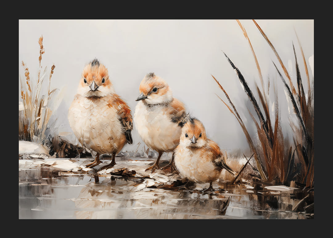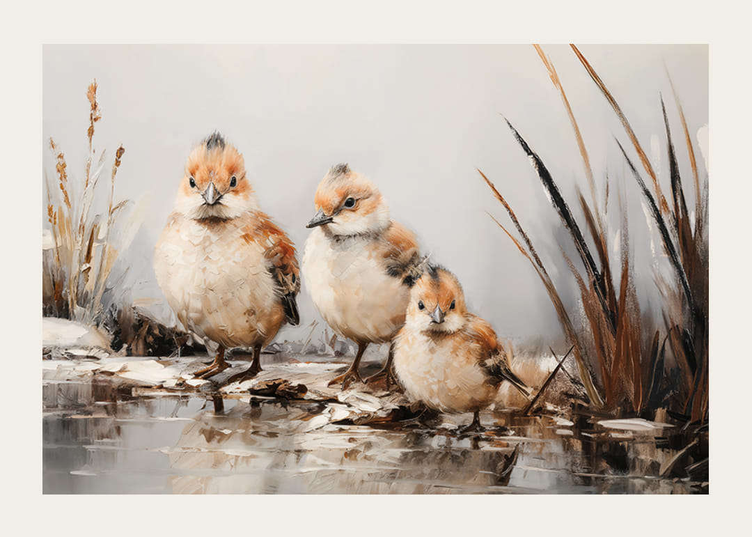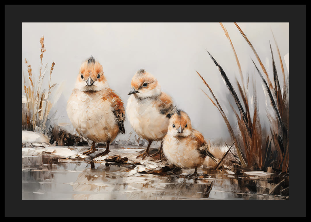 Skap en harmonisk atmosfære med denne nydelige plakaten! Bildet viser tre små, luftige fugler som står sammen i vannkanten, omgitt av siv og gress. Deres myke fjærdrakt og vennlige uttrykk fanger stillheten og enkelheten i naturen, og gjør denne plakaten til en perfekt dekorasjon for å tilføre varme og ro til hjemmet. En nydelig påminnelse om naturens sjarm og de små øyeblikkene med fred.