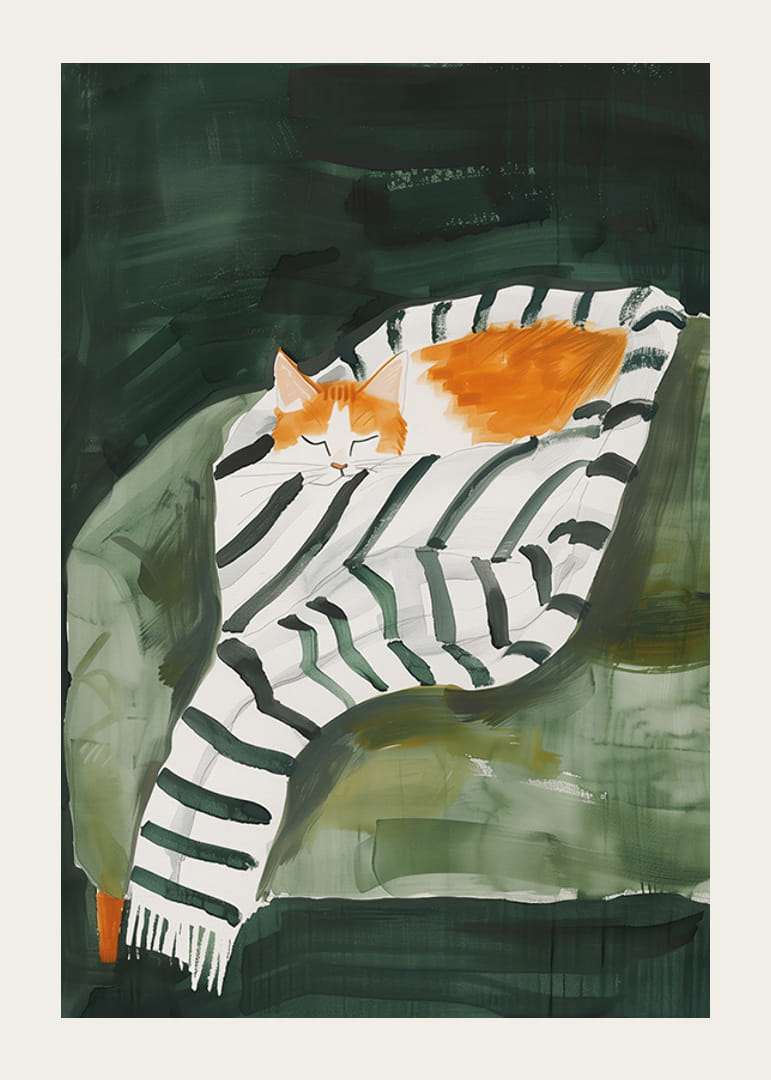 Denne sjarmerende plakaten viser en oransje katt som sover trygt pakket inn i et stripete teppe på en grønn lenestol. De dype, varme fargene og den avslappede atmosfæren skaper en følelse av ro og hjemlighet.