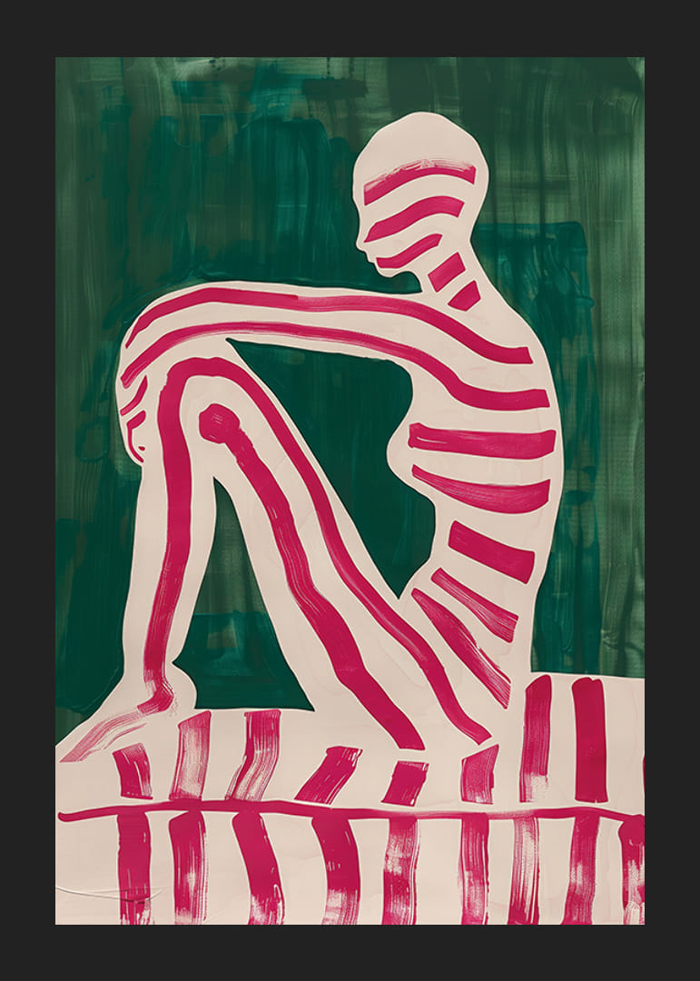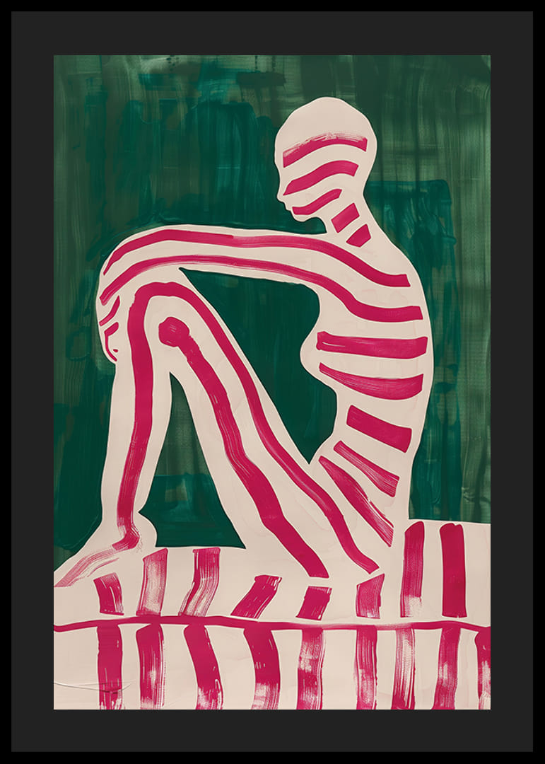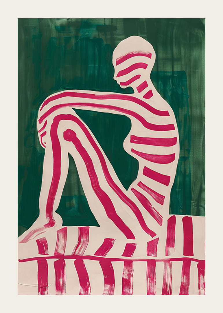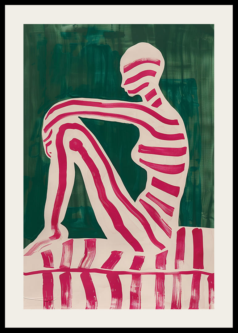 Denne stilige og abstrakte plakaten viser en sittende figur i røde, feiende striper mot en dyp grønn bakgrunn. Kunstverkets minimalistiske design og sterke kontraster skaper et moderne og tankevekkende preg.