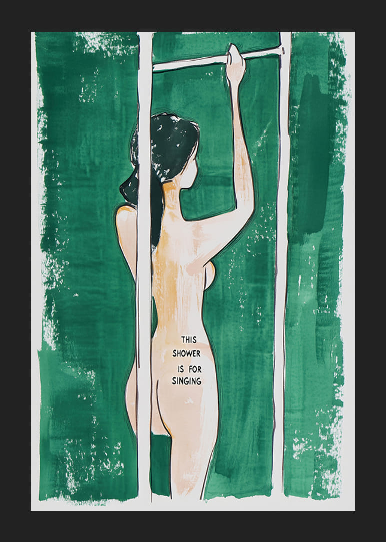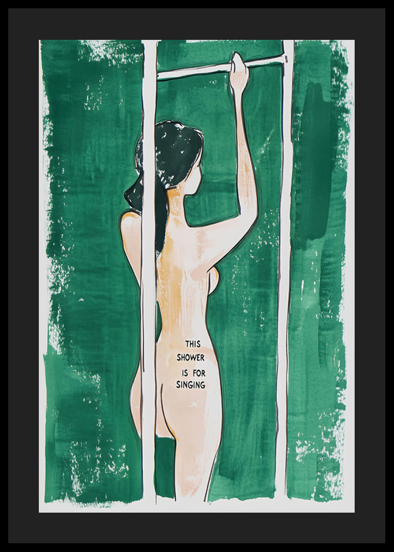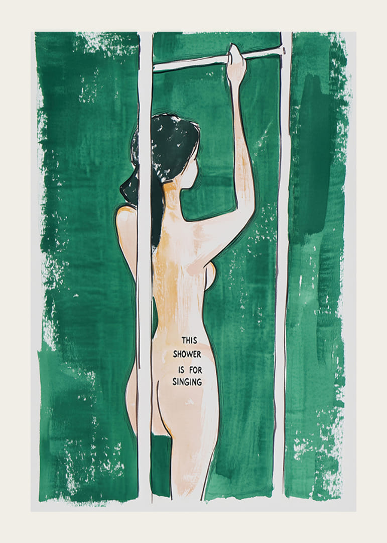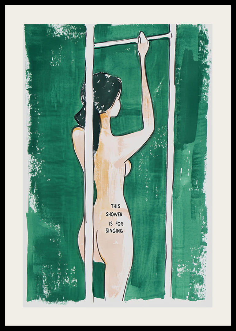Denne stilige og lekne plakaten viser en kvinne i dusjen med teksten "This Shower is for Singing" diskret plassert på baksiden. De dype grønntonene og enkle penselstrøkene skaper en moderne og avslappet følelse.