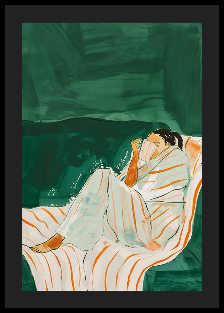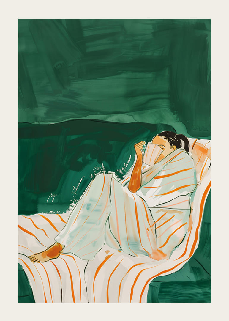 Denne koselige plakaten viser en kvinne pakket inn i et hvitt teppe med oransje striper, som sitter avslappet på en grønn sofa med en kopp varm drikke i hendene. De varme tonene og myke penselstrøkene skaper en følelse av ro og komfort.