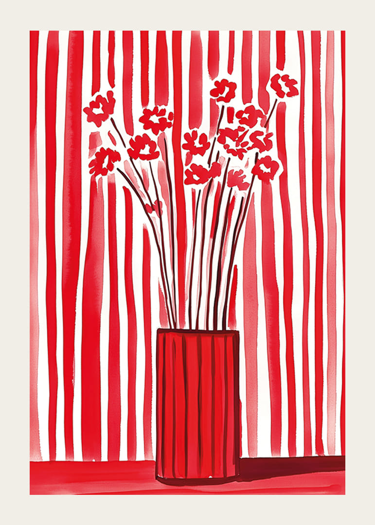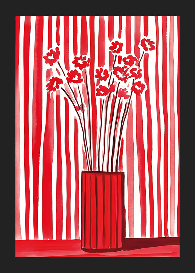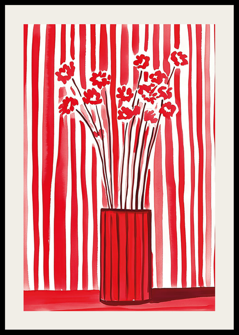 Forvandle rommet ditt med dette livlige plakatkunstverket, der rytme og harmoni møtes i en eksplosjon av rødt og hvitt. De lekne, håndmalte stripene skaper et fascinerende bakteppe for de elegante blomstene, hvis enkle skjønnhet fanger øyet.