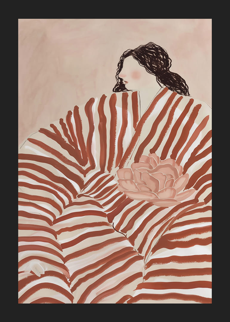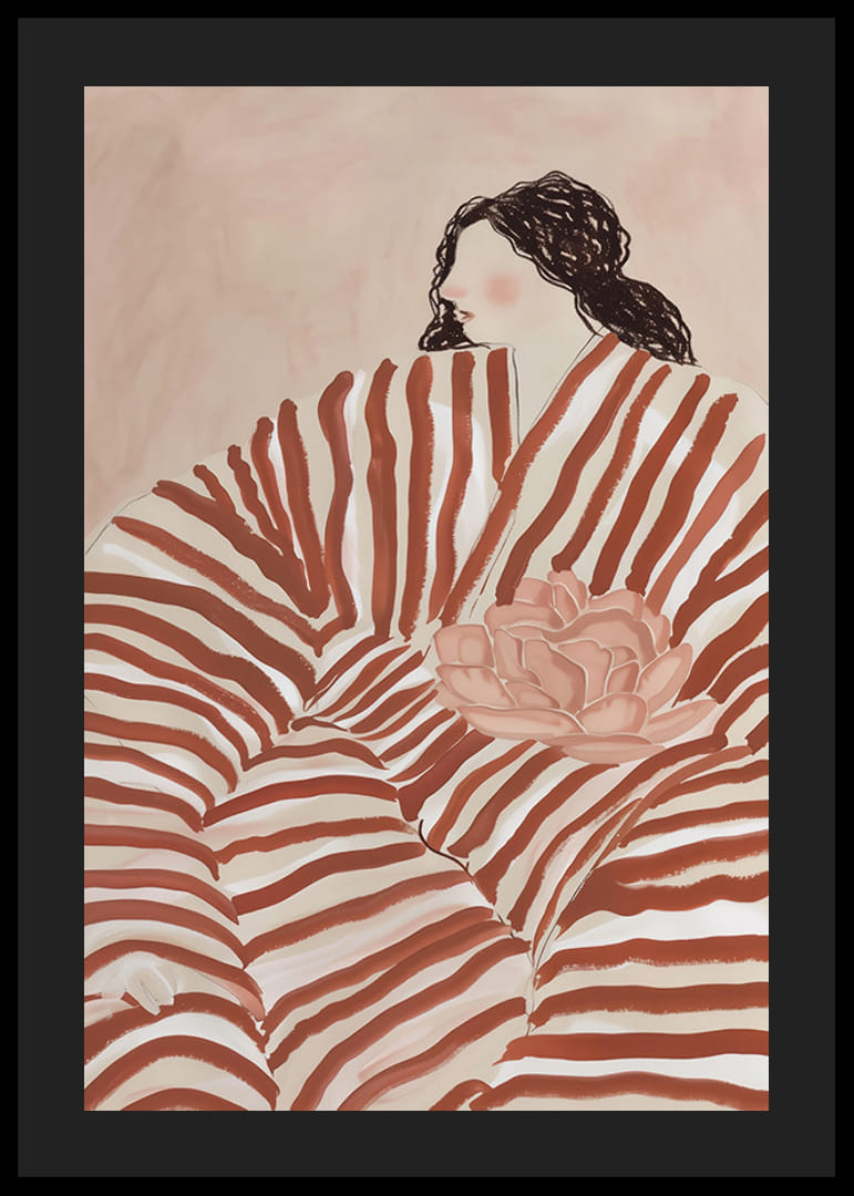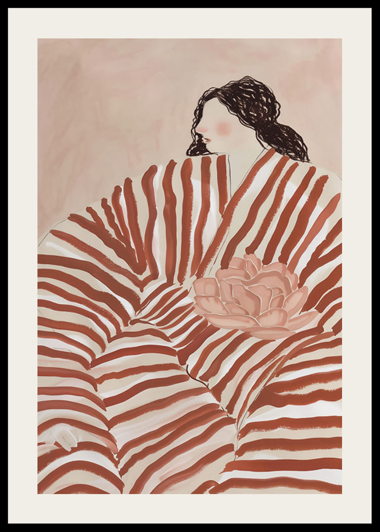 Oppdag elegansen til denne drømmende plakaten der sterke, bølgende striper omfavner en meditativ figur. Med myke nyanser av jordfarger og blomsterdetaljer formidler bildet en tidløs følelse av ro og introspeksjon.