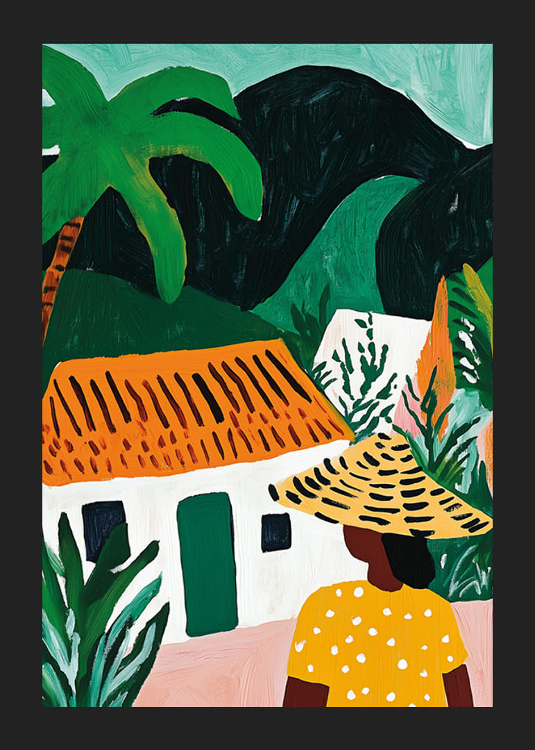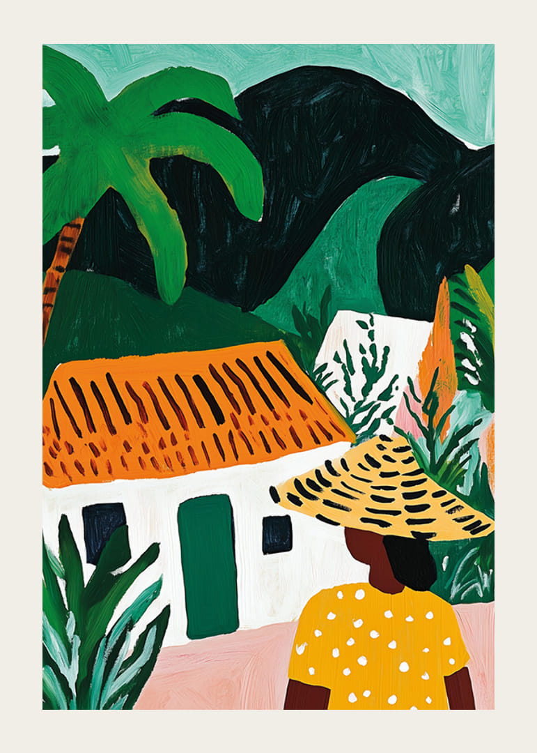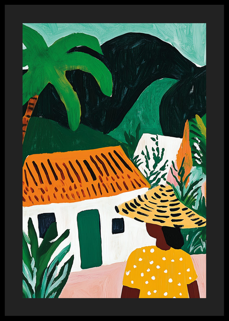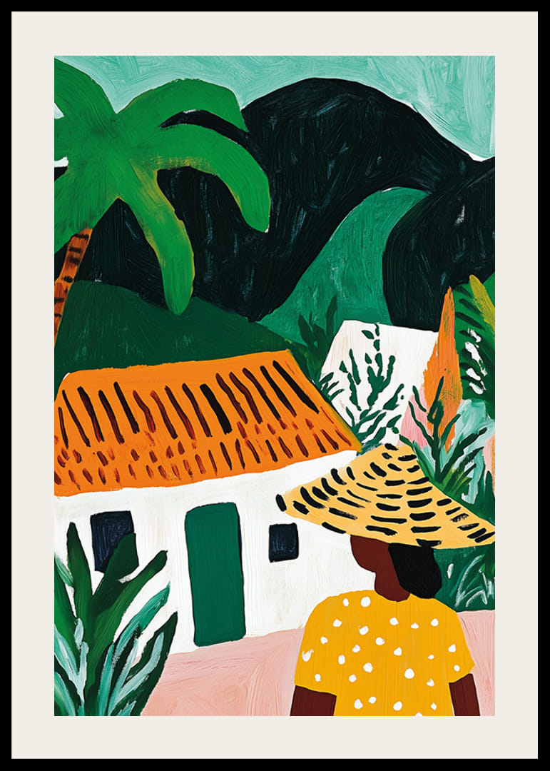 Beundre denne fengslende plakaten der fargene spruter av liv. Sjarmen til den eksotiske atmosfæren fanger en kvinne i polkaprikkede gult foran en pittoresk hytte med et brennende oransje tak. Palmer strekker seg mot en dyp grønn bakgrunn som inviterer deg til å drømme om fjerne land.