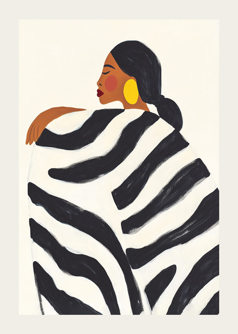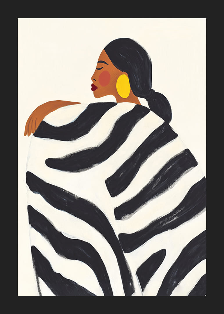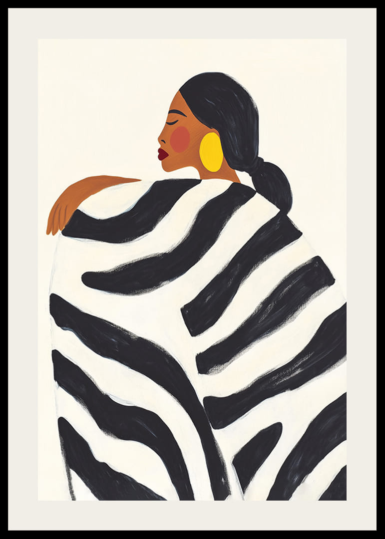 Utforsk dristig eleganse med denne fengslende plakaten, der stil møter selvtillit i en harmonisk balanse mellom svarte og hvite mønstre. Den myke silhuetten og rike fargetonene gir en følelse av sofistikert enkelhet.