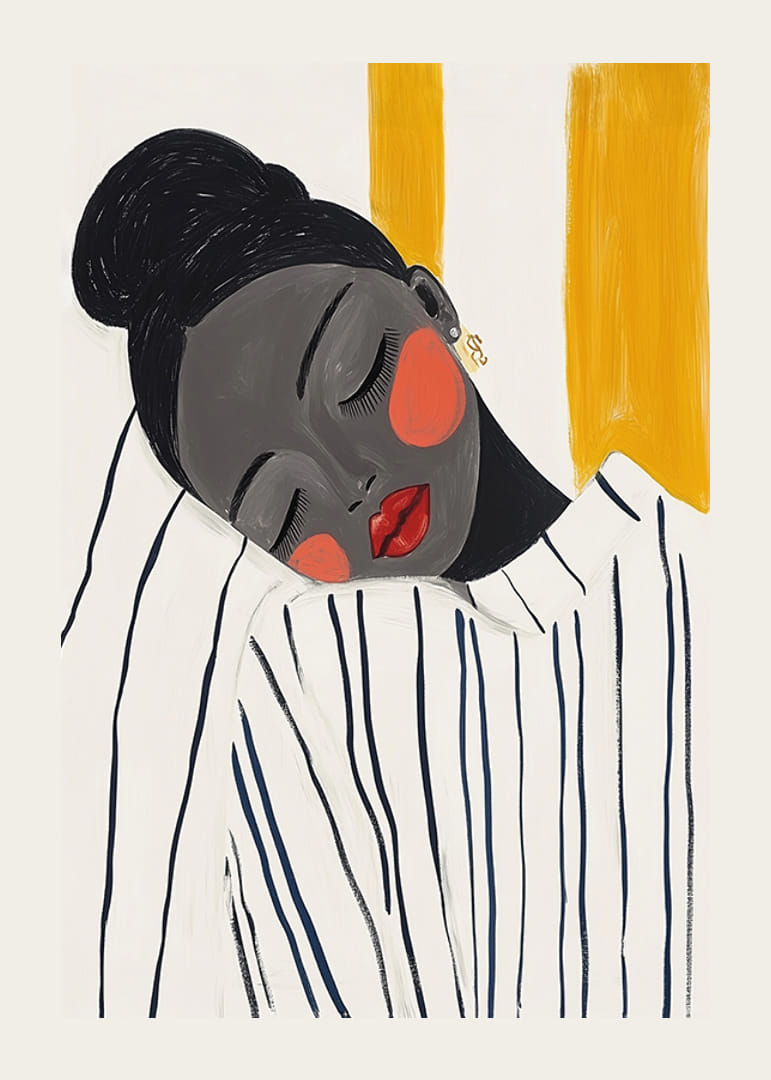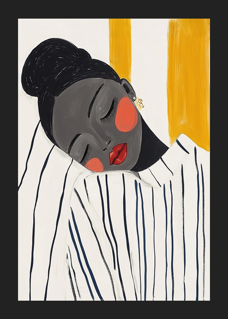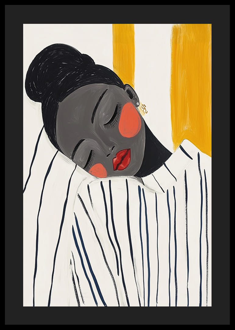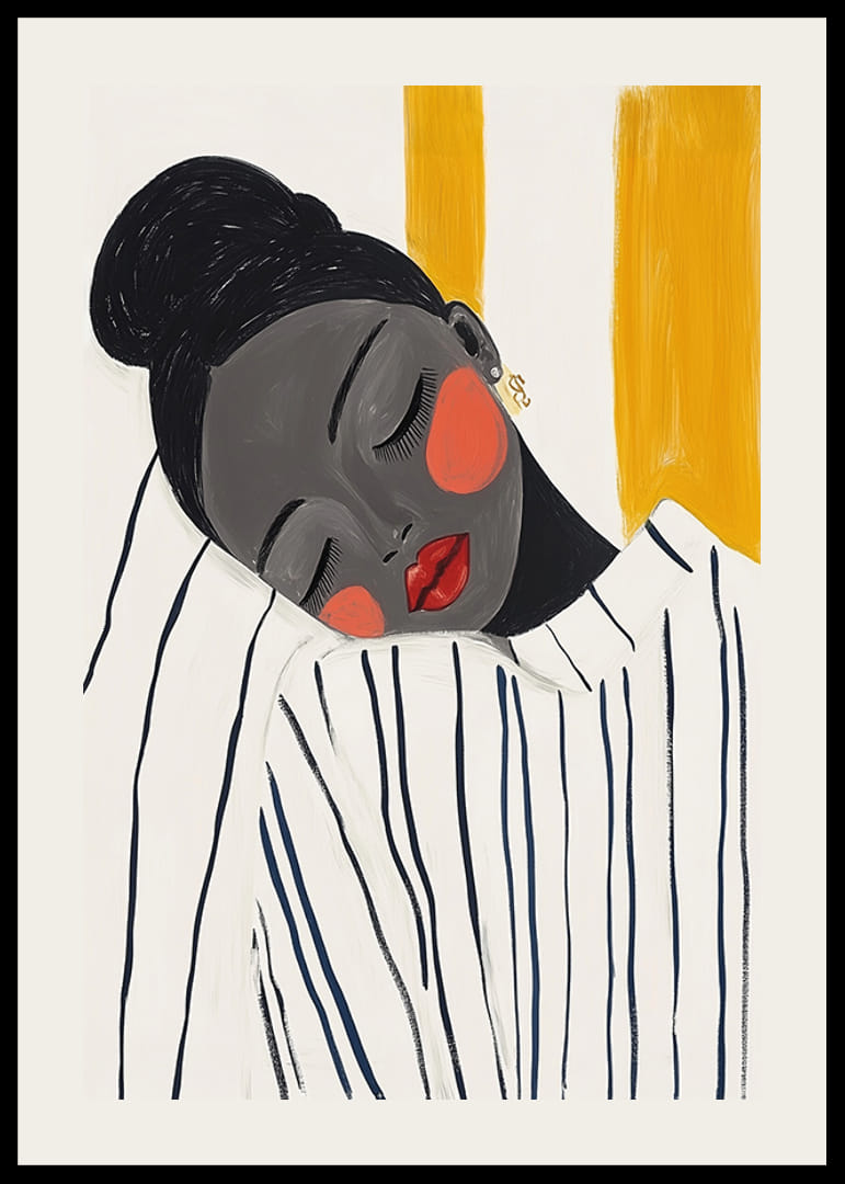 Opplev elegansen til denne plakaten som fanger et stille øyeblikk av fred og skjønnhet. Kvinnens lukkede øyne og den kontrasterende fargepaletten av dyp sort, varm rød og dempet gul skaper en harmonisk følelse.
