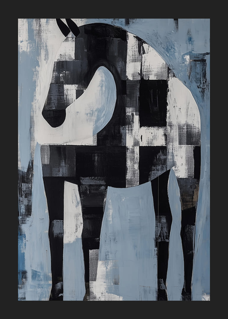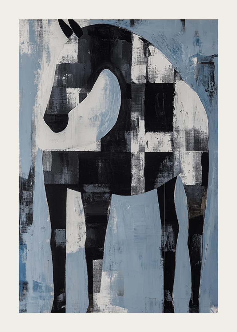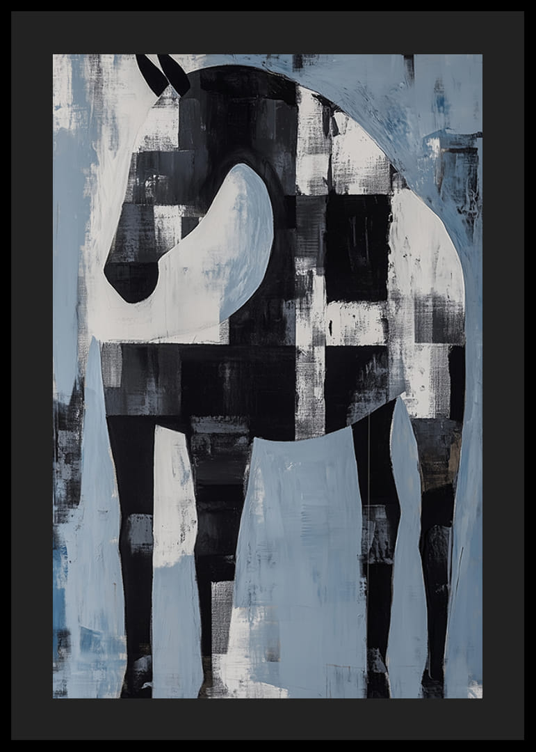 Fang den subtile elegansen til denne plakaten der en svart og hvit hest dukker opp i et abstrakt landskap. De dristige penselstrøkene og skiftende nyanser av blått og hvitt skaper en harmonisk balanse som taler til både dristighet og ro.