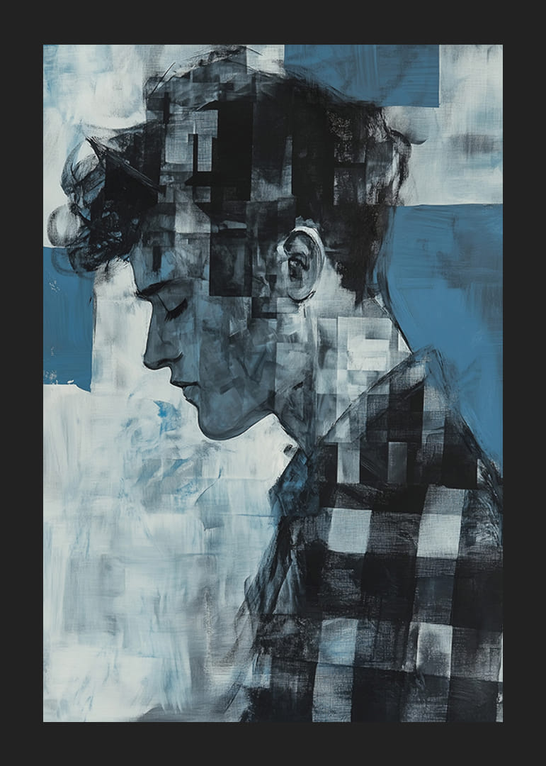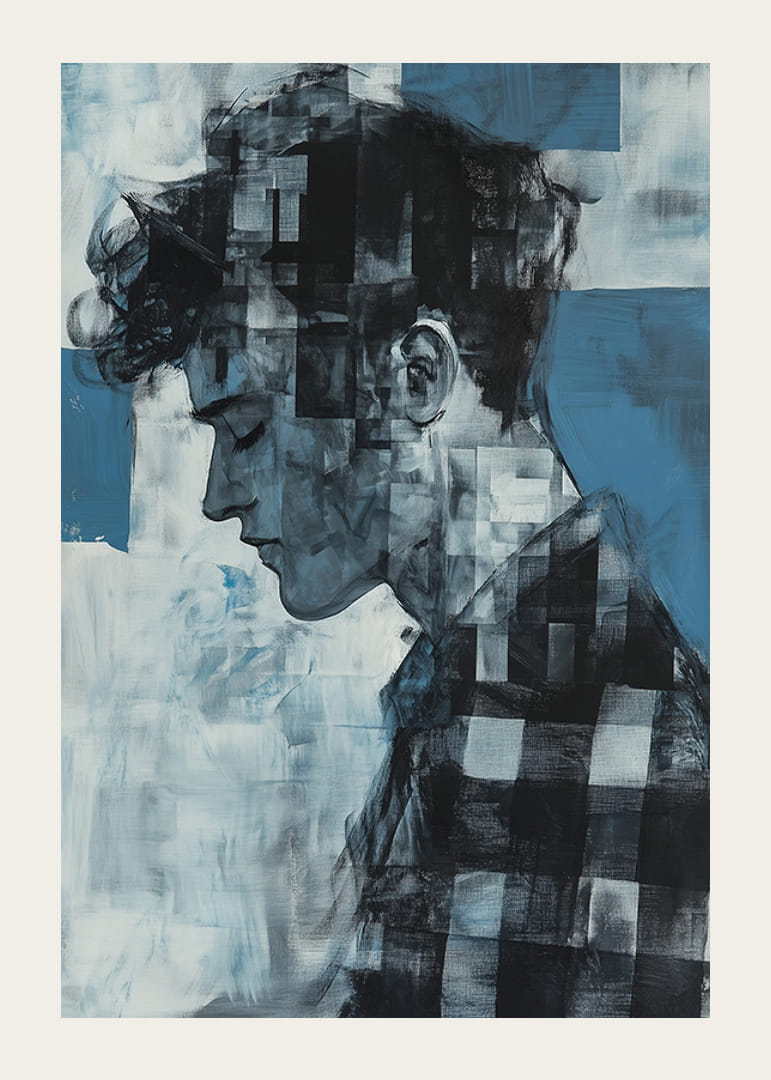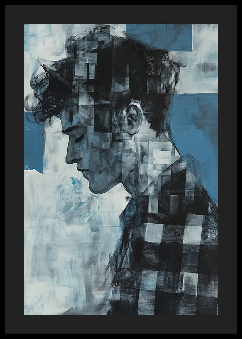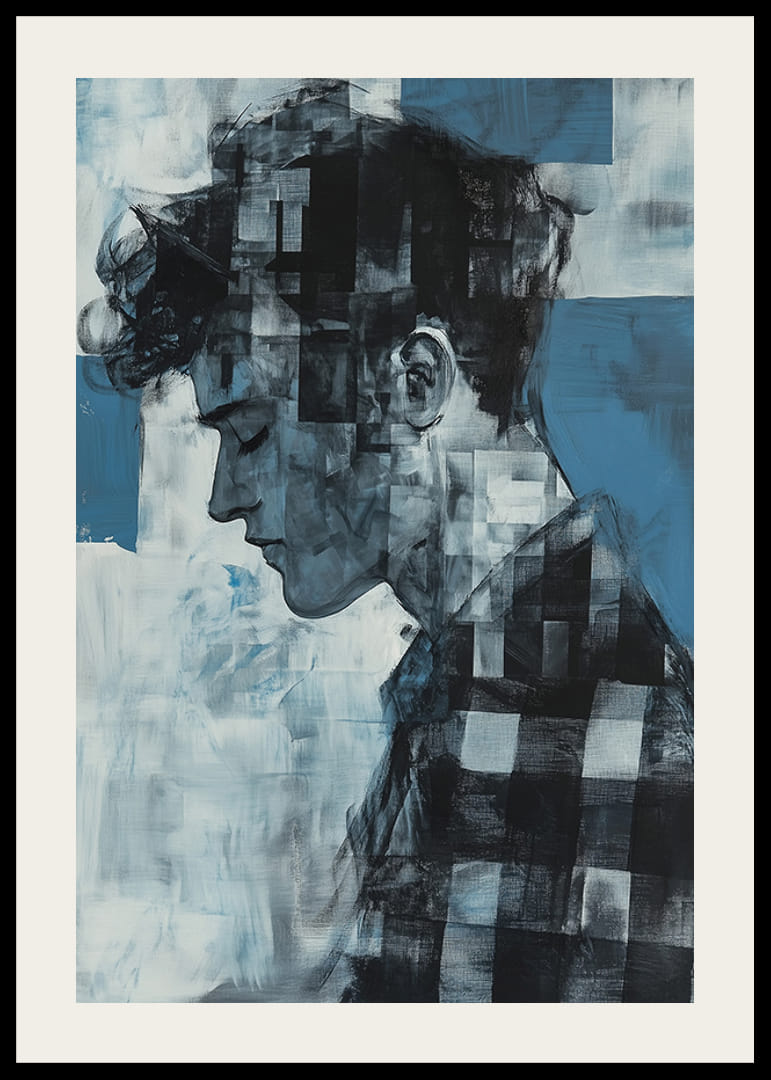 Denne plakaten fanger den ettertenksomme silhuetten til en ung mann i en fascinerende mosaikkstil, der de forskjellige blånyansene gir en følelse av dybde og omtanke. De skiftende tonene i hvitt og blått skaper en følelse av stillhet og introspeksjon.